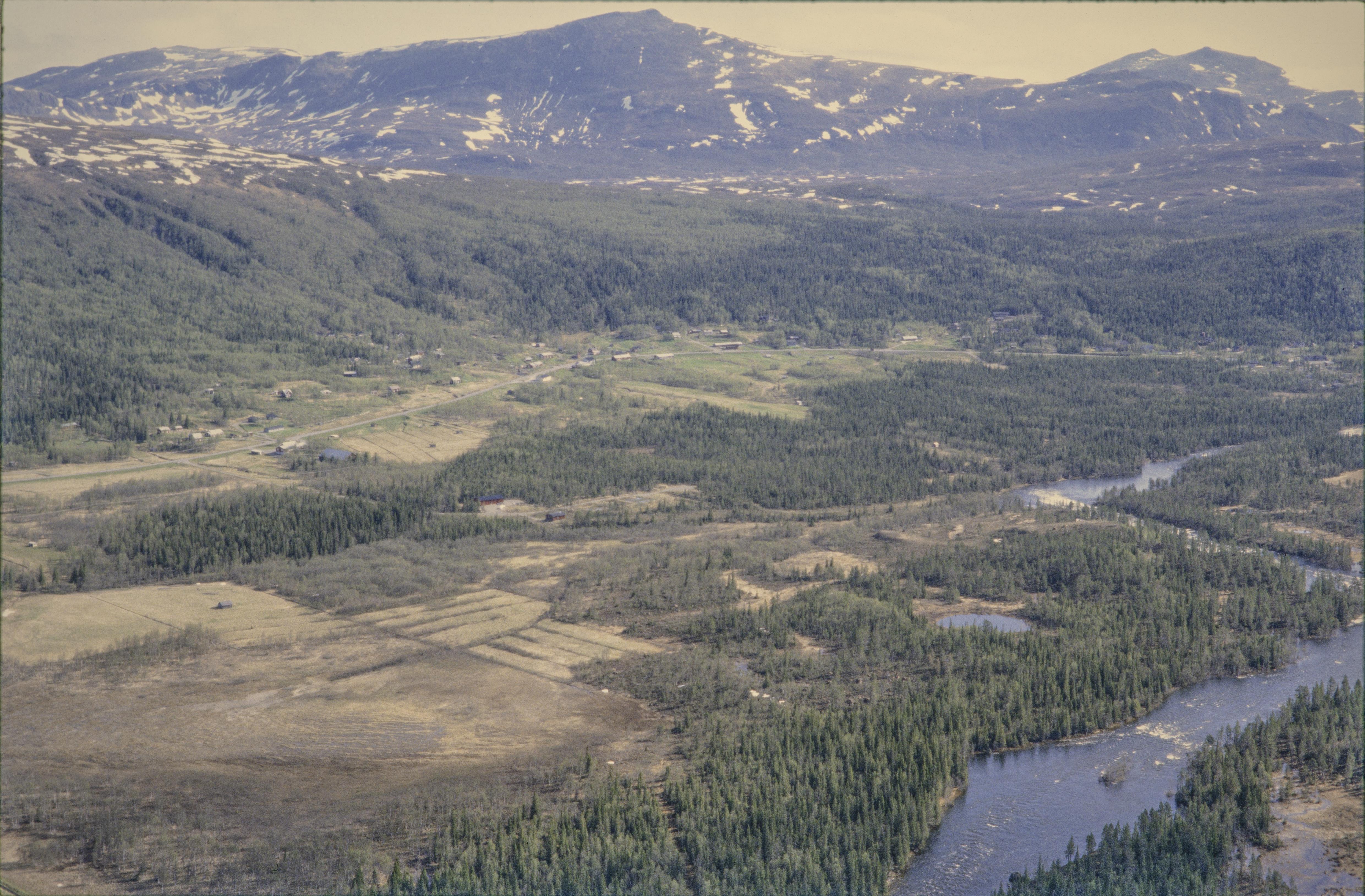 Beskrivning: Orten Kittelfjäll under fjälltopparna Kittelfjället (Stuore Giebnie) och Henriksfjället (Onne Giemnie) i Vojmåns dalgång. Vid ån nere till höger en fyndplats (skärvsten) RAÄnr Vilhelmina 1086:1. Bilden är tagen mot (väderstreck): NNO
