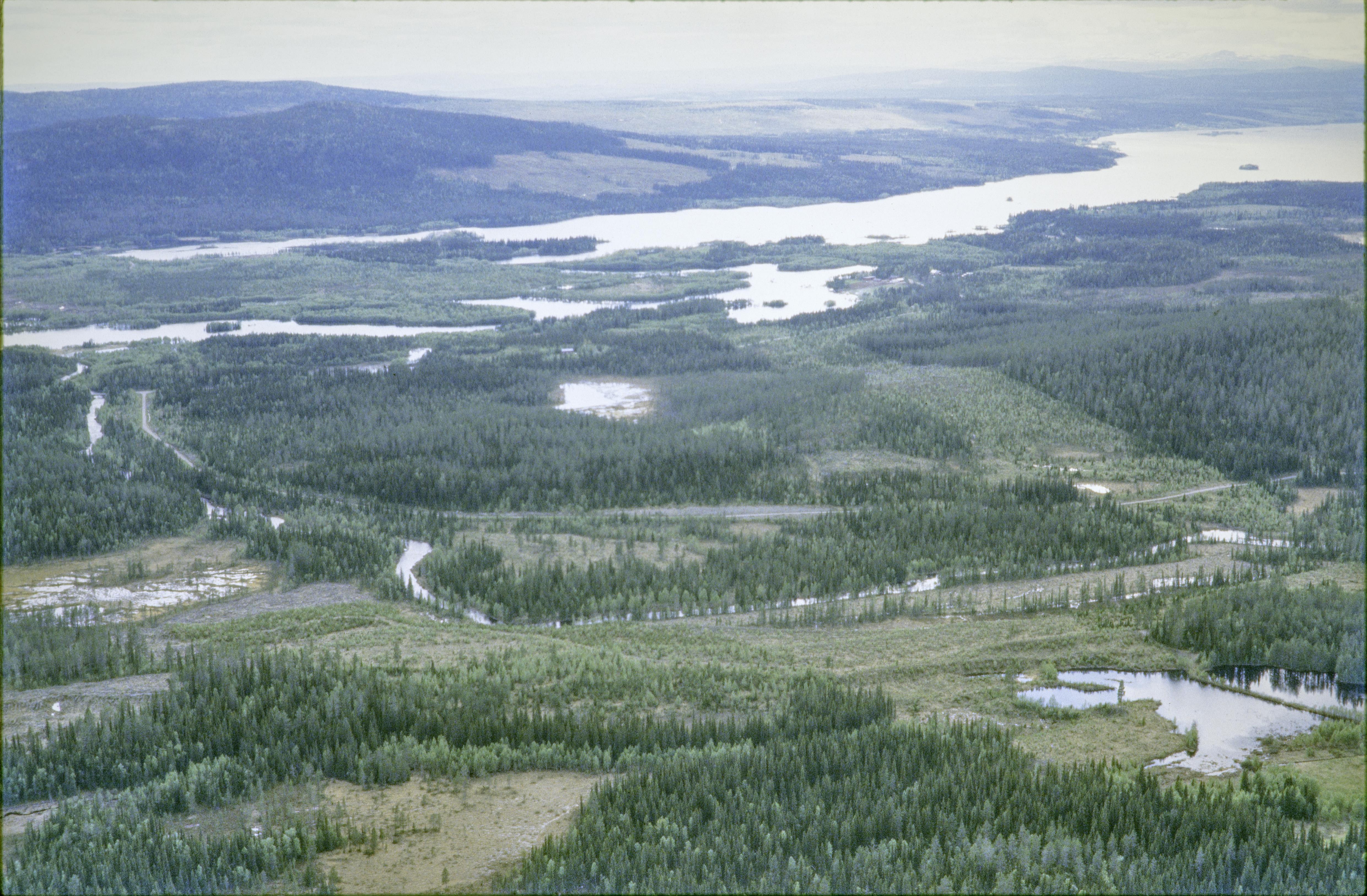 Beskrivning: Fångstmiljö i området mellan Gråtanån och Vojmån i Vojmsjöns sydöstra ände. Område med flera boplatser och fångstgropssystem. Vid tjärnen nere till höger fångstgrop RAÄnr Vilhelmina 1203:1. Vid bildens mitt boplats RAÄnr Vilhelmina 568:1 m.fl. Bilden är tagen mot (väderstreck): SV