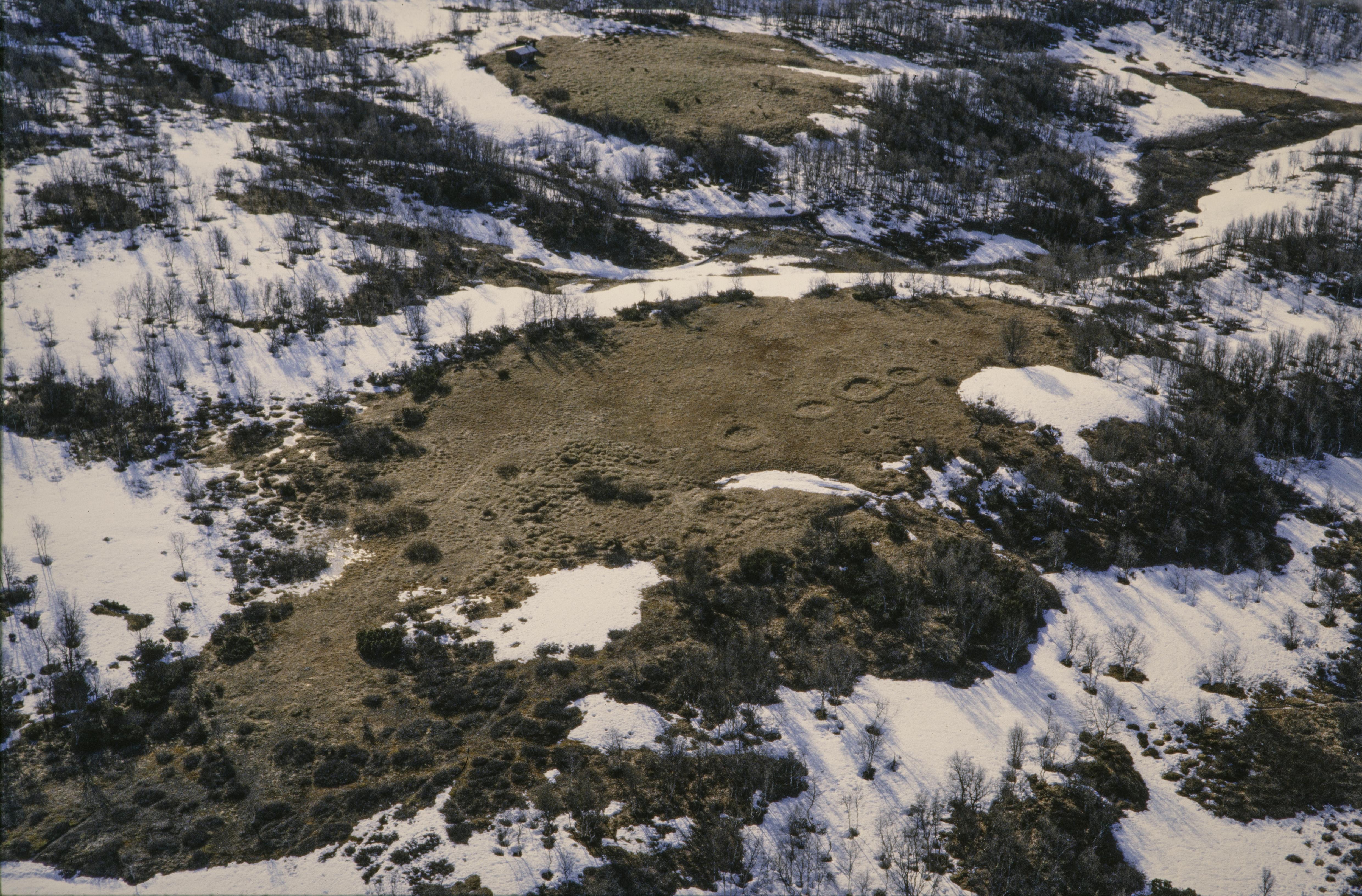 Beskrivning: Remdalen (Tjoelmenvaegkie). Vid bildens mitt stalotomter (hyddbottnar) RAÄnr Vilhelmina 14:1. I bildens övre kant ett sameviste med två byggnader i dalsidan vid bäcken Vaegkiejohke. Bilden är tagen mot (väderstreck): SO