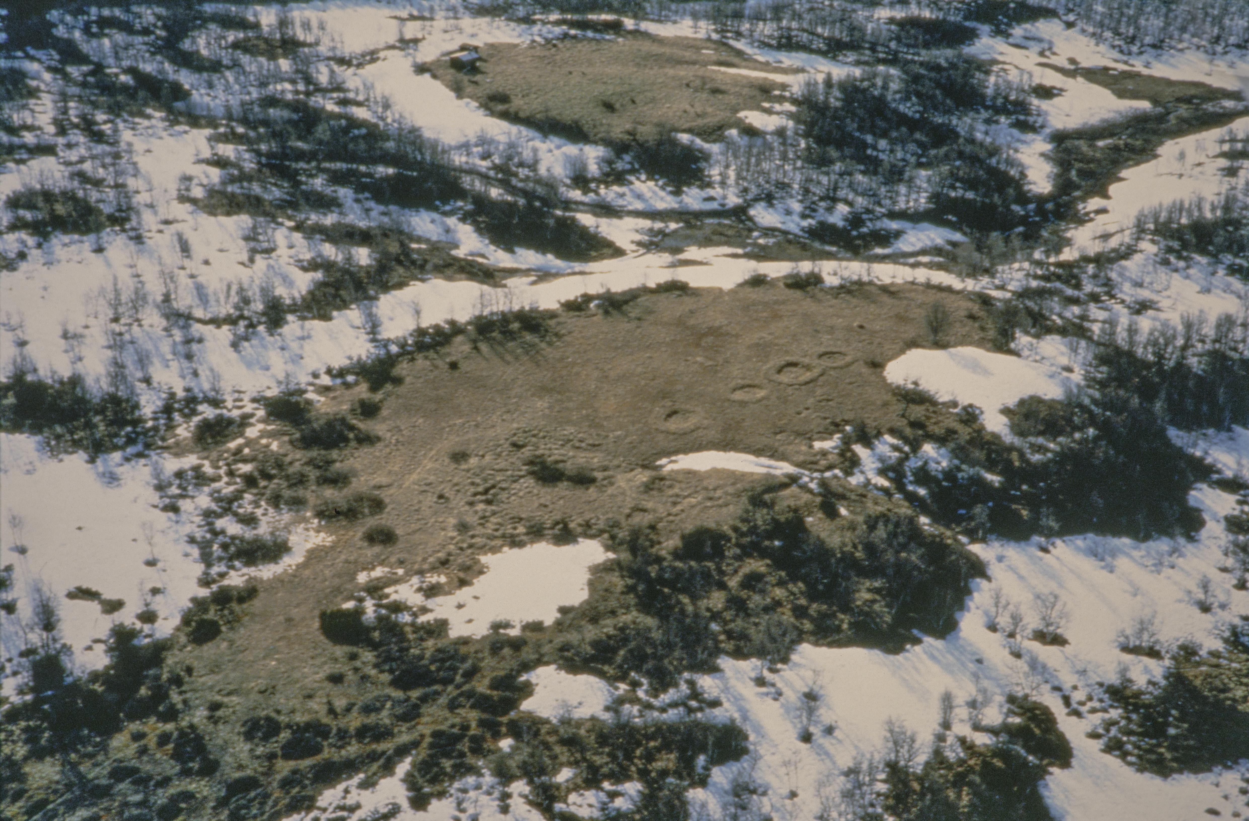 Beskrivning: Remdalen (Tjoelmenvaegkie). Vid bildens mitt stalotomter (hyddbottnar) RAÄnr Vilhelmina 14:1. I bildens övre kant ett sameviste med två byggnader i dalsidan vid bäcken Vaegkiejohke. Bilden är tagen mot (väderstreck): SO