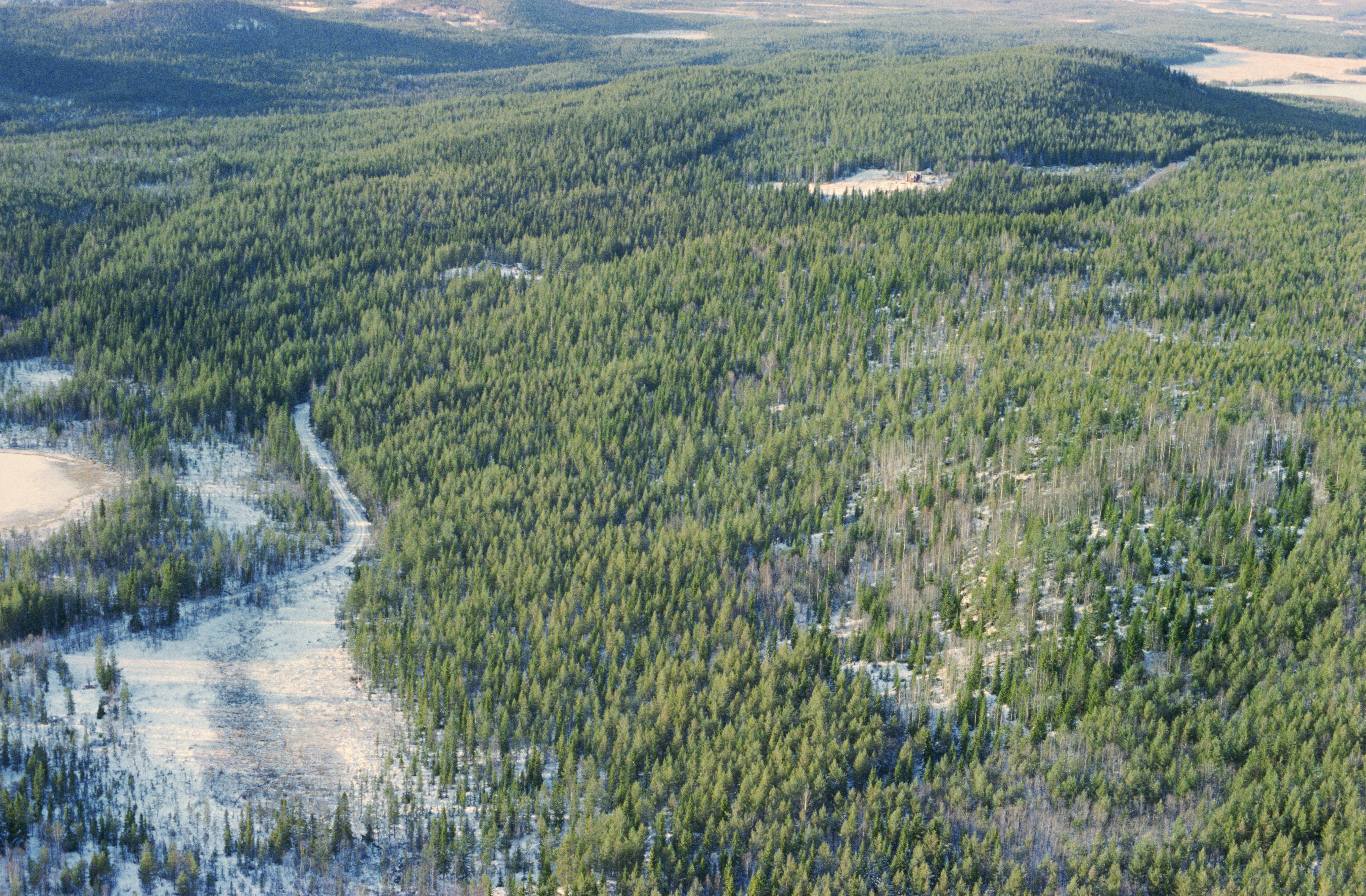 Beskrivning: Nere till vänster Säljbergtjärnen i dalgången vid Storberget nordost om Sämsjön. I skogen vid bildens mitt fångstgrop RAÄnr Åsele 152:1 och hällmålning RAÄnr Åsele 151:1. I bildens övre kant gränsen mot Dorotea socken. Bilden är tagen mot (väderstreck): NV
