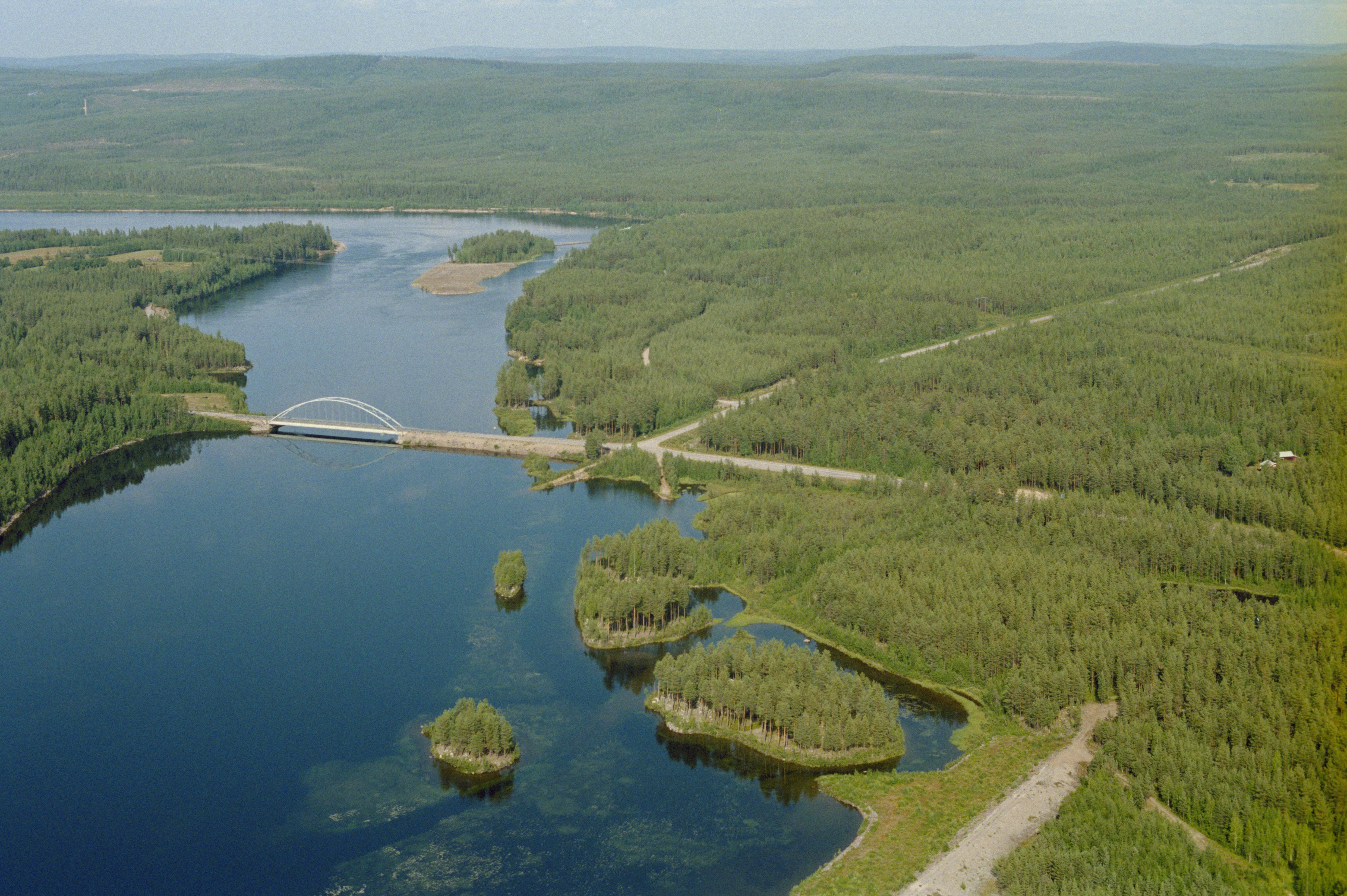 Beskrivning: Luleälven (Julevädno) vid byn Mellandet, norr om området Laxede. Byggnadsminnet "Engelska kanalen"RAÄnr Edefors 24:3 längs högra älvstranden över bildens mitt. Forsholmen och byn Överedet i bildens övre del. Bilden är tagen mot (väderstreck): NNO
