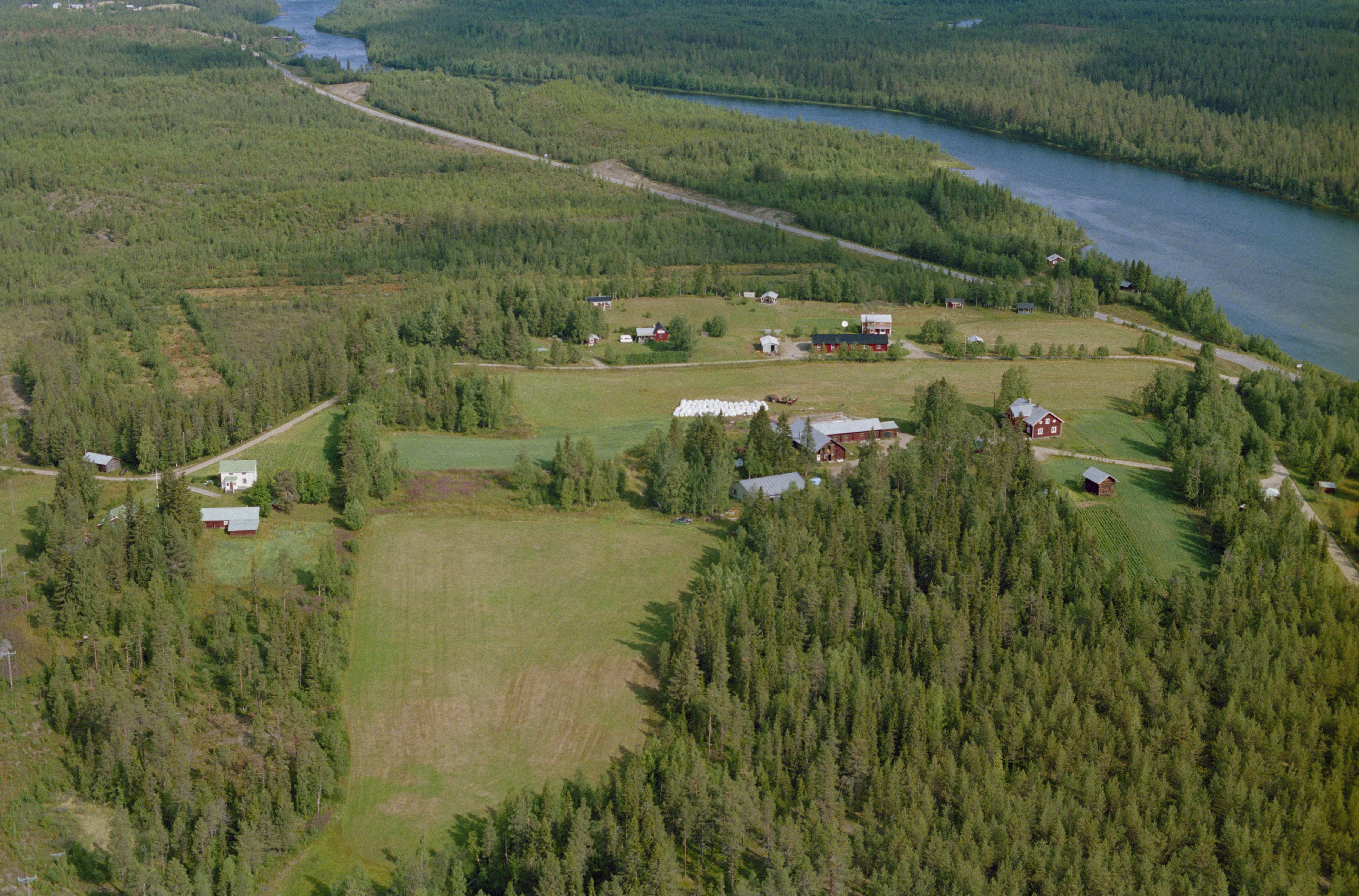 Beskrivning: Torneälven i Tornedalen. Vid bildens mitt Tornefors bruk (Tornionkoskin). Kolningsanläggning RAÄnr Junosuando 346 till höger över bildens mitt. Bilden är tagen mot (väderstreck): N