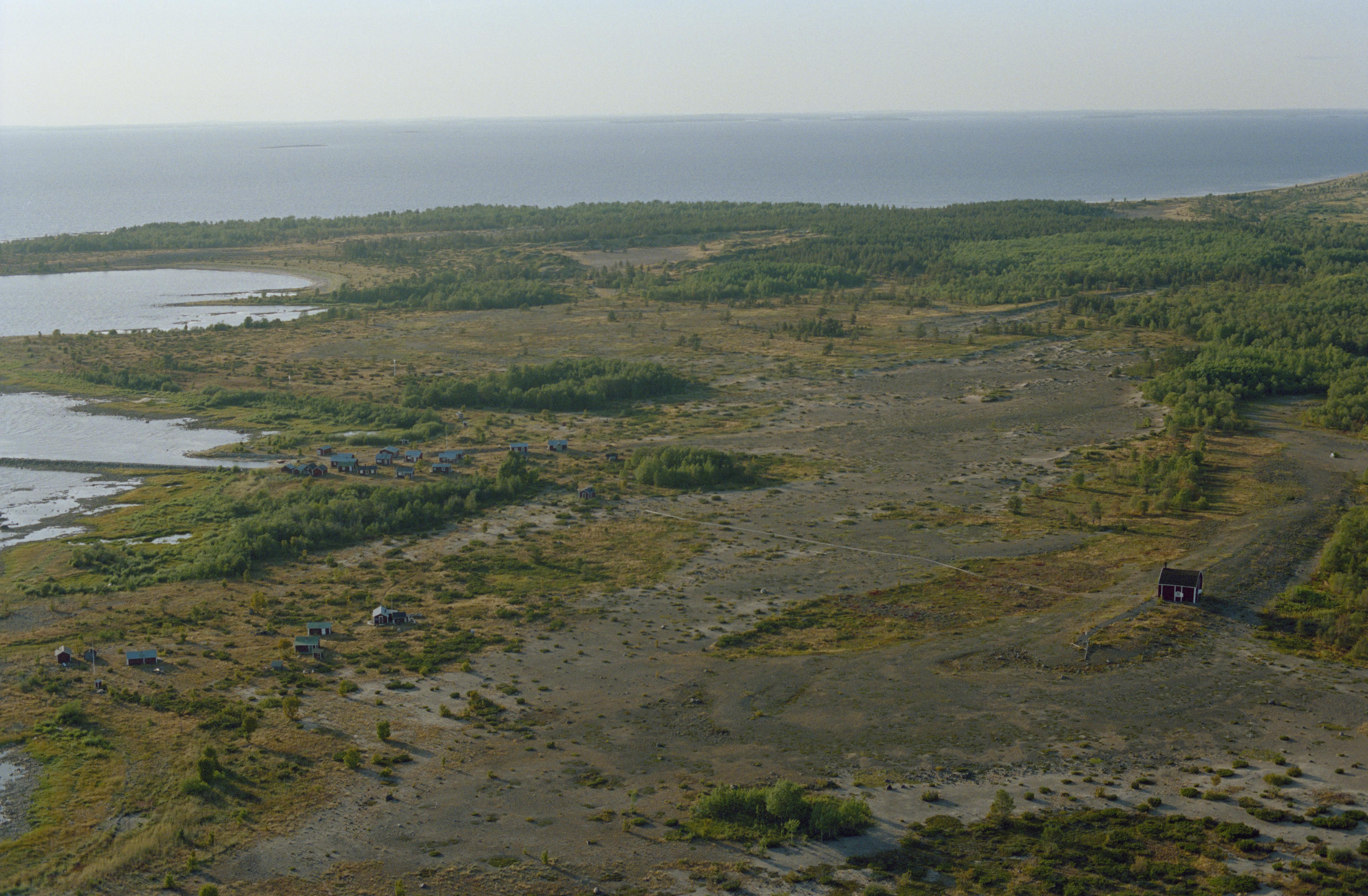 Beskrivning: Södra delen av ön Sandskär (Sanskeri) i Haparanda skärgårds nationalpark och naturreservat. Kumpula fiskeläge, gravplats, färdväg RAÄnr Nedertorneå 20:1-6, 62:1, 65:1, m.m. Sandskärs kapell till höger. Bilden är tagen mot (väderstreck): NV