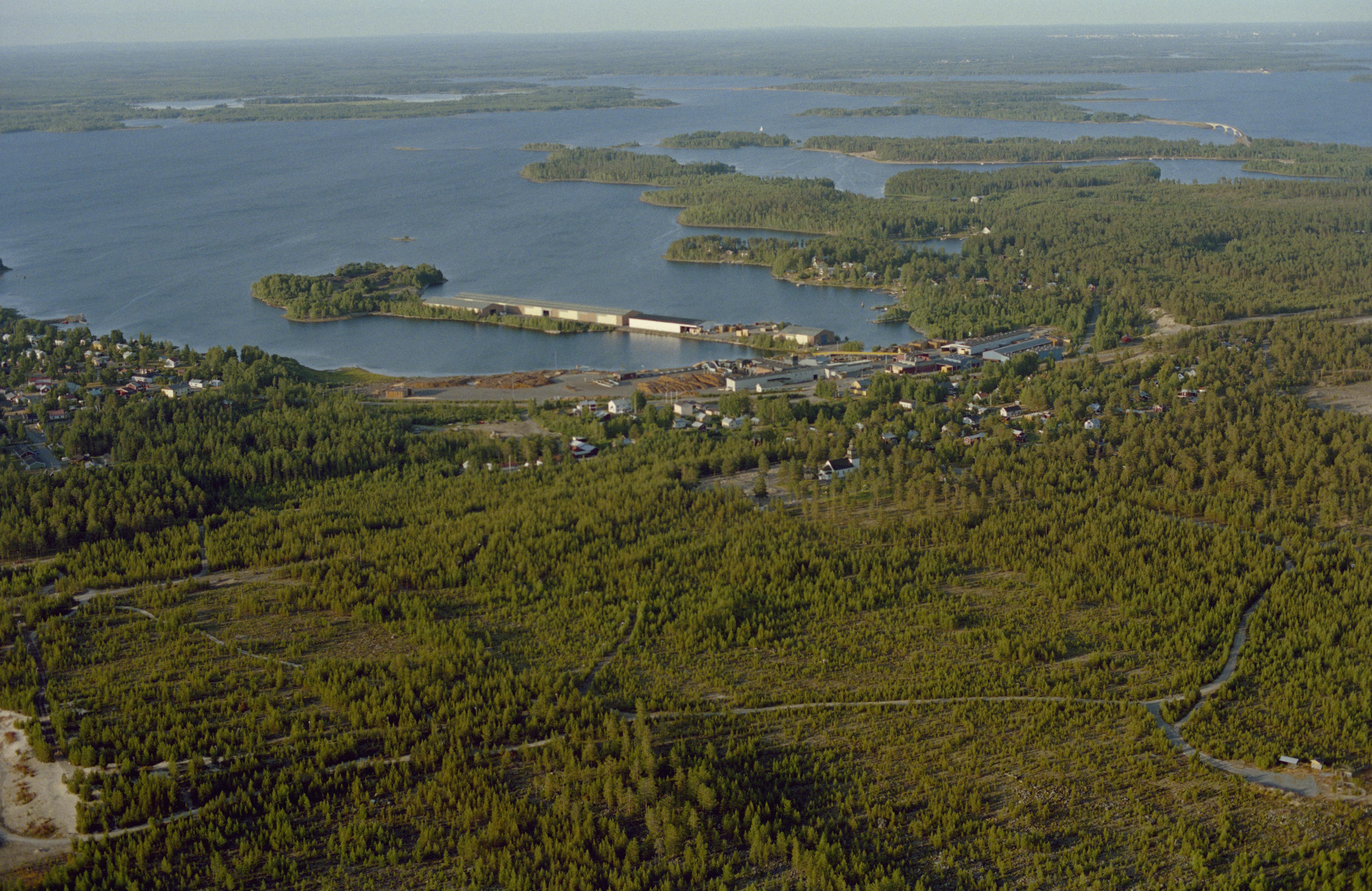 Beskrivning: Seskarö tätort, kyrkby och sågbrukssamhälle i norra delen av ön Seskarö (Seittenkaari) i Haparanda skärgård. Seskarö kyrka till höger om bildens mitt. Uppe till höger hamnen RAÄnr Nedertorneå 143:1 vid långa udden Lannaska. Bilden är tagen mot (väderstreck): NO