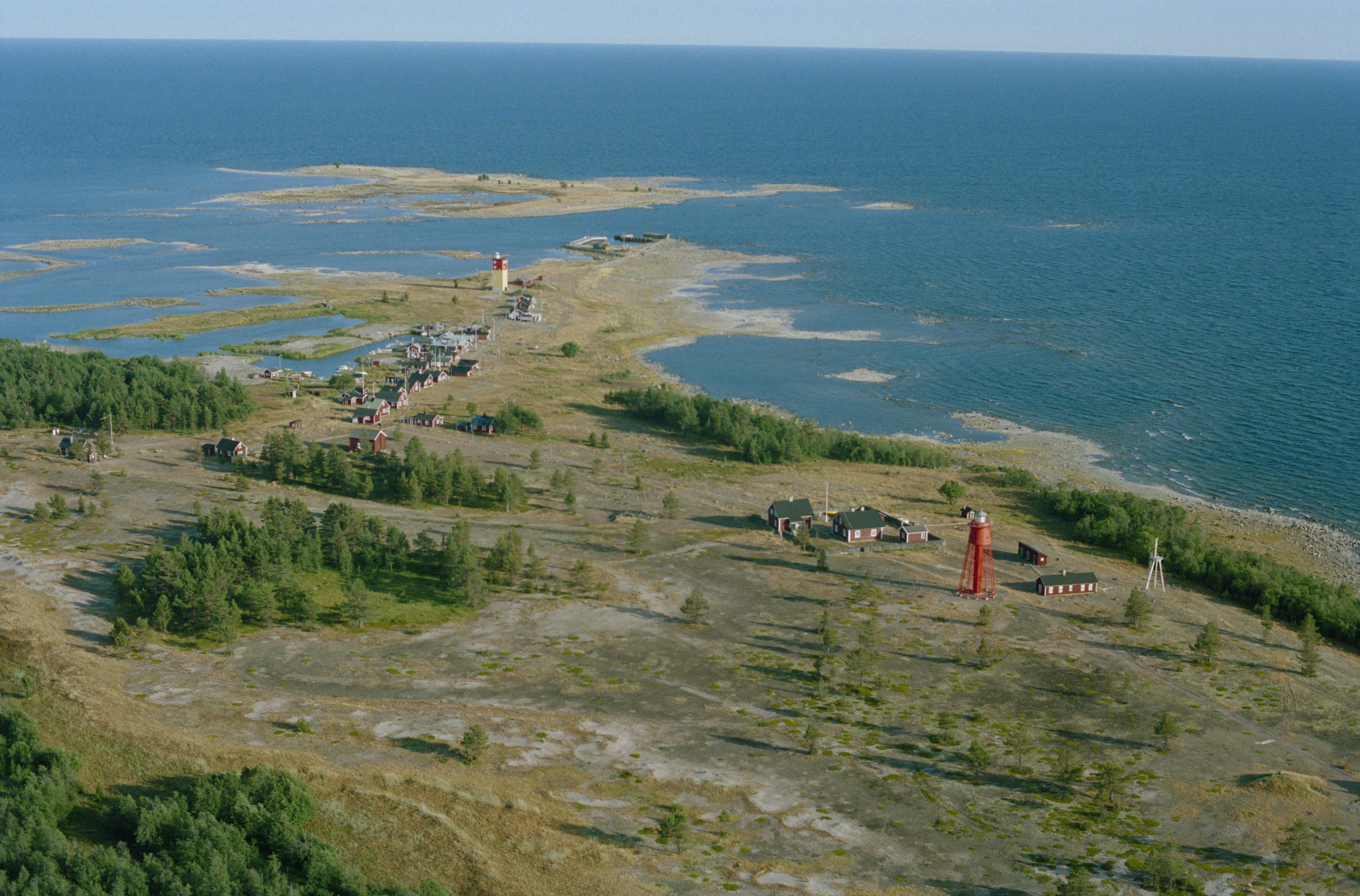 Beskrivning: Ön Rödkallen i Kallfjärden. Till vänster om bildens mitt Rödkallens kapell. Till höger om bildens mitt Rödkallens gamla fyrplats med en fyr av Heidenstam-typ. Vid fyren labyrint RAÄnr Nederluleå 66:1-2. Över bildens mitt södra delen av ön med fiskarstugor och Rödkallens södra fyrplats. Delar av ön ingår i Rödkallens naturreservat. Bilden är tagen mot (väderstreck): SO