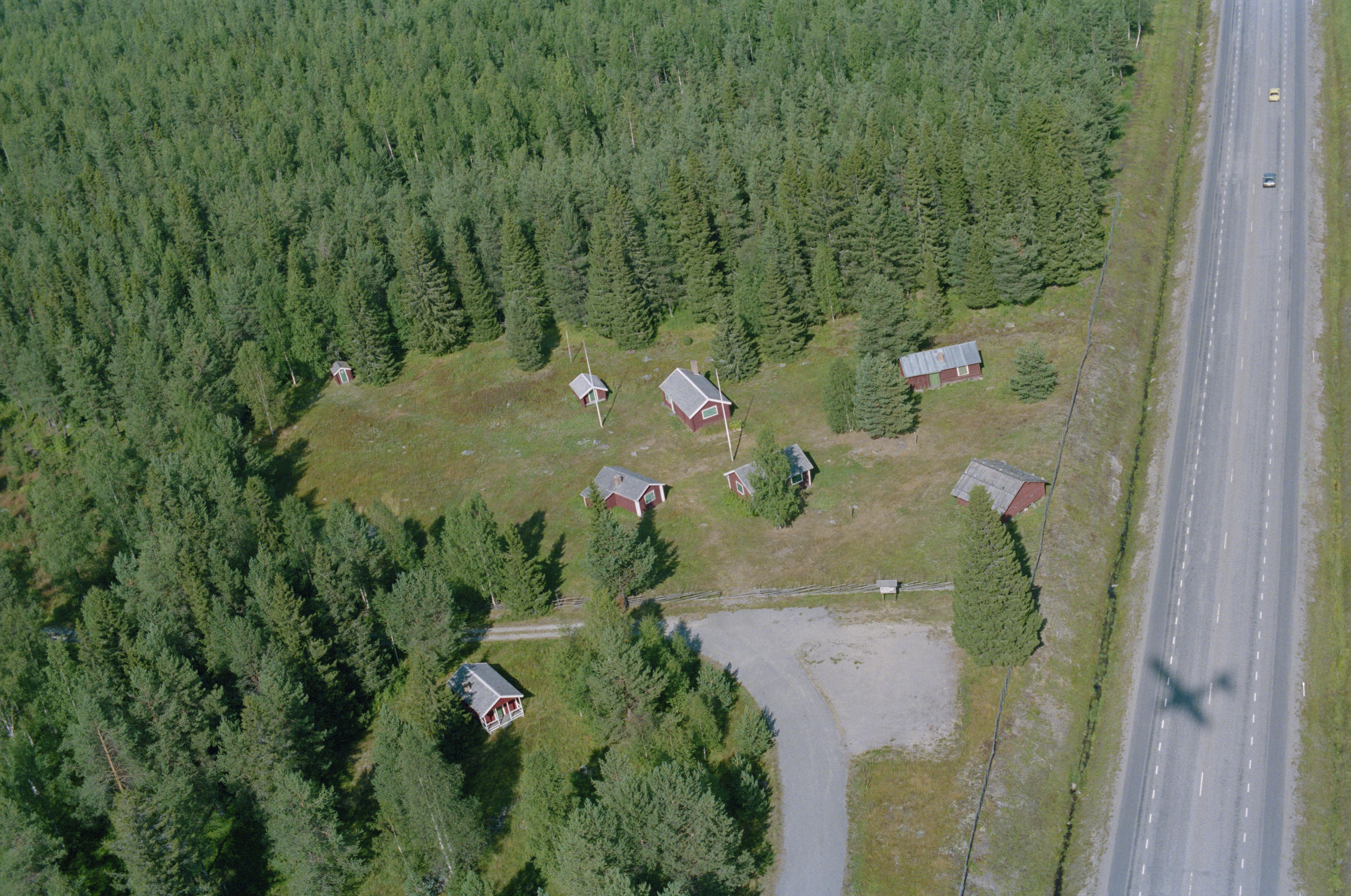 Beskrivning: Rosviksbodarna RAÄnr Norrfjärden 202:1, Fäbodsmiljö under Rosviks by med stugor och ladugårdar med rötter i 1600-talet. (NB! Flygplanets skugga syns i bilden.) Bilden är tagen mot (väderstreck): NO