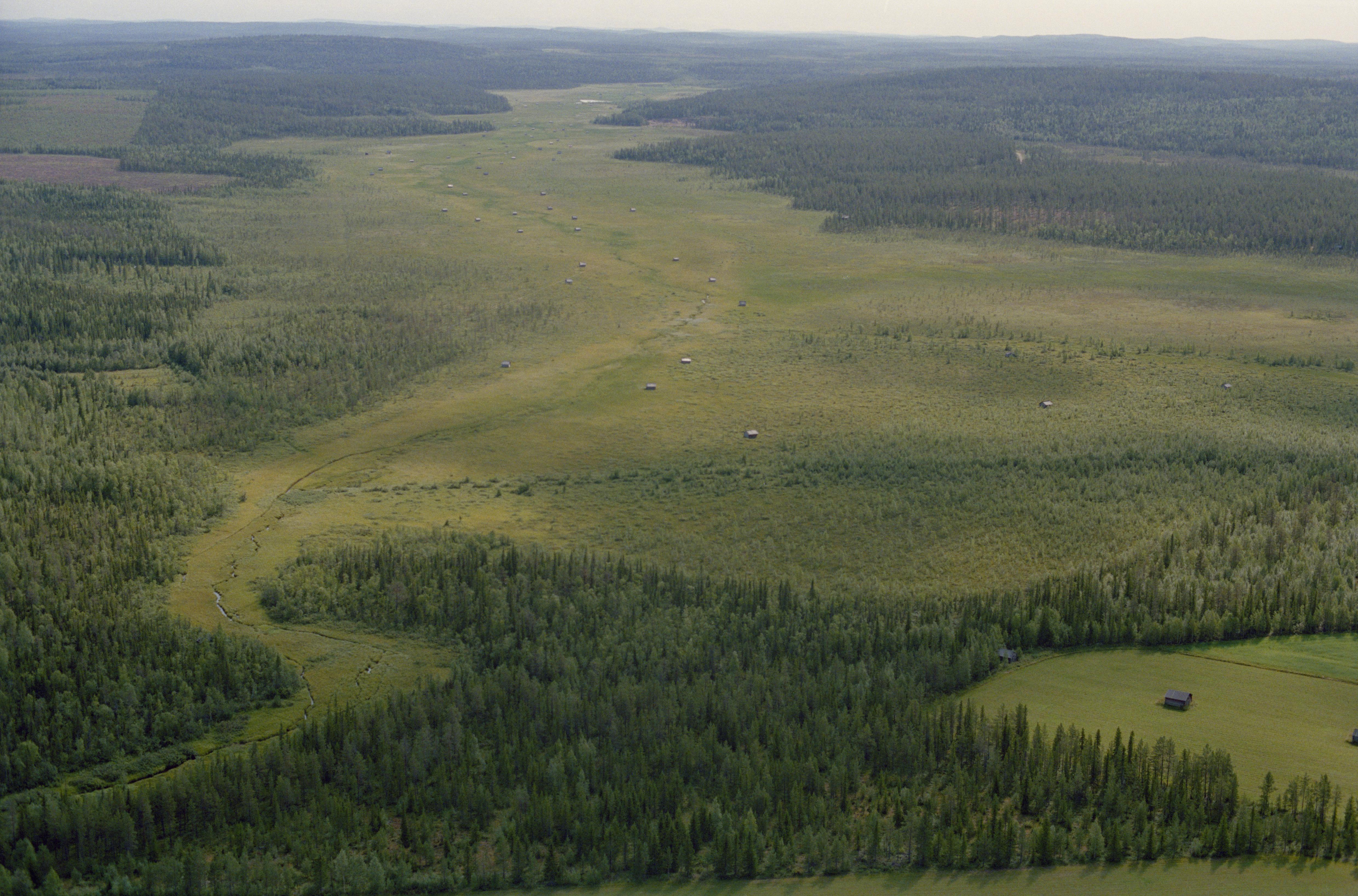 Beskrivning: Anmärkning (övrig): Området är söder om fornlämning RAÄnr Pajala 223:1 (ej i bilden). Riksintresse-nr/namn: BD53 - Erkheikki - Juhonpieti. Socken: Pajala. Motivering: Bymiljö bestående av två sammanvuxna jordbruksbyar med bevarad bebyggelse och belägen i nära anslutning till det nordliga bondehushållets nödvändiga resurser: älven, skogen, slåttermyren mm. - Uttryck för riksintresset: Slåttermyren Vasikkajoki med ett 50-tal upprustade lador. 1954 fanns över 170 lador på myren. "Potatiskullen" i Erkheikki. Byabebyggelsen och odlingslandskapet. Fäboden vid Liviöjoki. [Texten uppdaterat av Riksantikvarieämbetet våren 2013.] Beskrivning: Myrområdet och naturreservatet Vasikkavuoma söder om byarna Erkheikki och Juhonpieti i Tornedalen. Ängslador på slåttermyr i dalgången längs åarna Vasikkajoki (i nordväst) och Lammijärvi (i sydost). Bilden är tagen mot (väderstreck): SO Fotosyfte: Flygbildsdokumentation