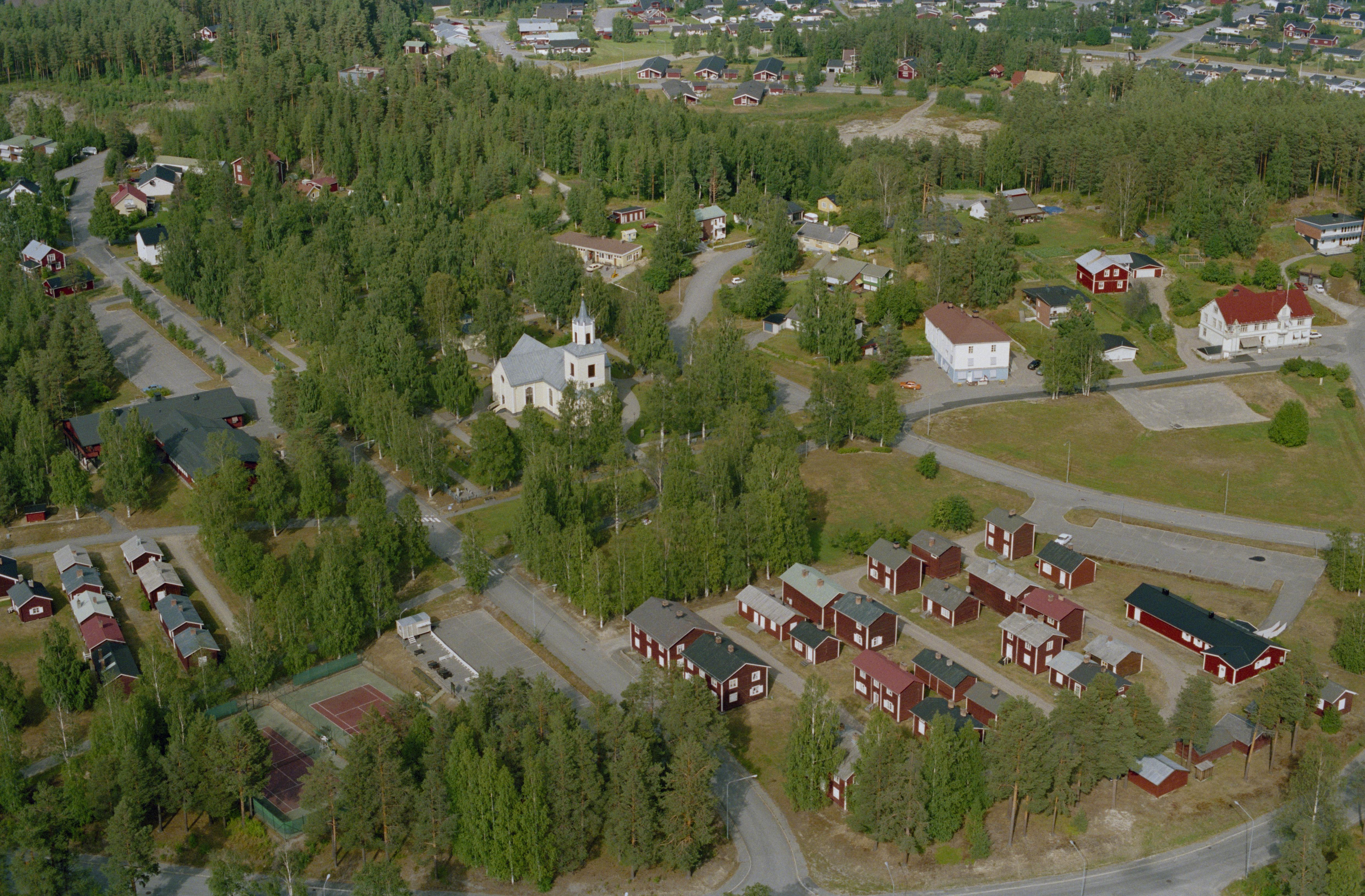 Beskrivning: Älvsbyn tätort och kyrkby vid Piteälven. Älvsby kyrka i bildens mitt. Vid kyrkan minnesmärke RAÄnr Älvsby 31:1. Bilden är tagen mot (väderstreck): NO
