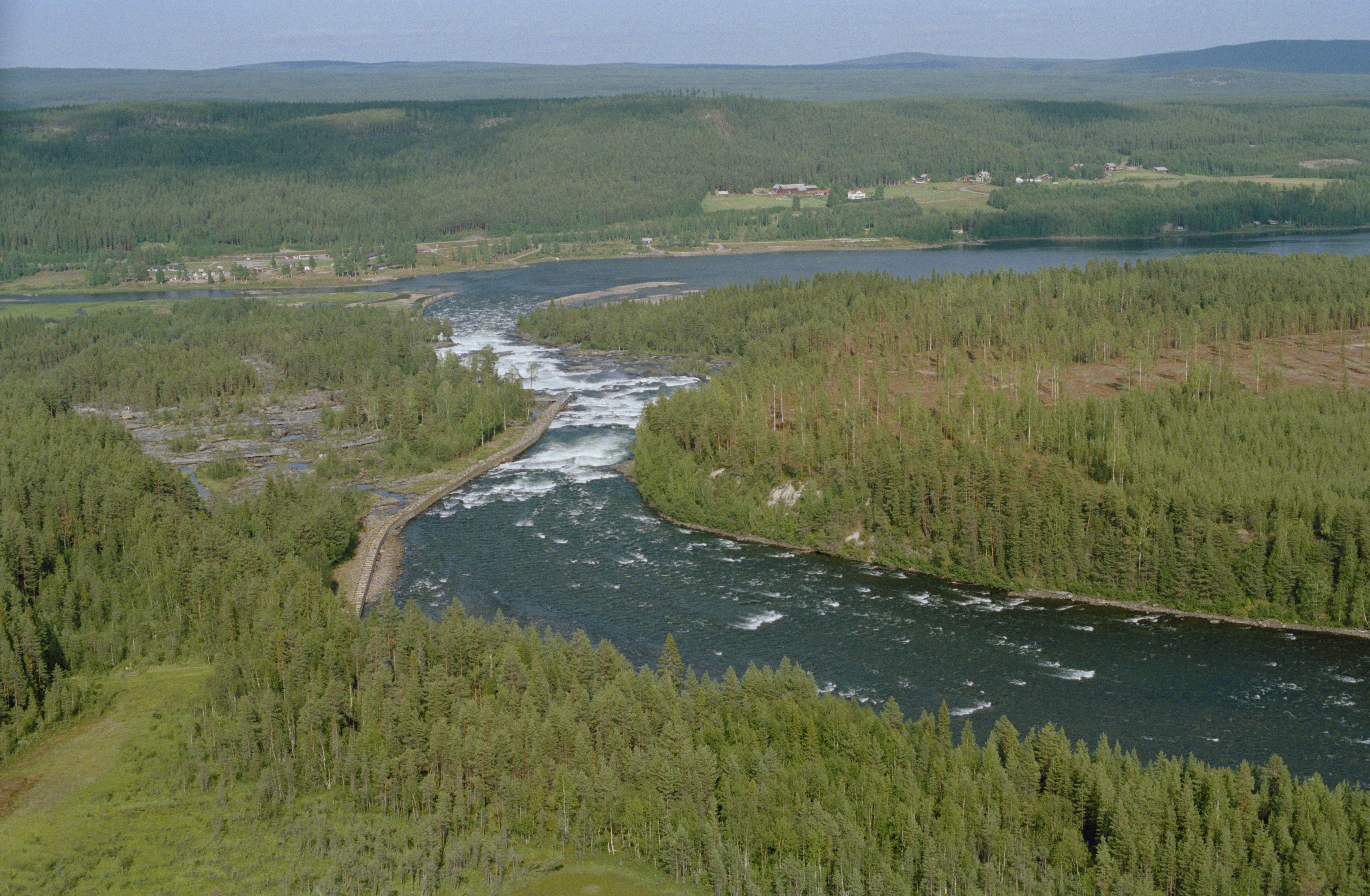 Beskrivning: Storforsen där Piteälven och Varjisån möts i sjön Bredselet. Till vänster om bildens mitt boplats RAÄnr Älvsby 952:1, 953:1, m.m. i området Döda fallet. Storforsens naturreservat. Bilden är tagen mot (väderstreck): NO