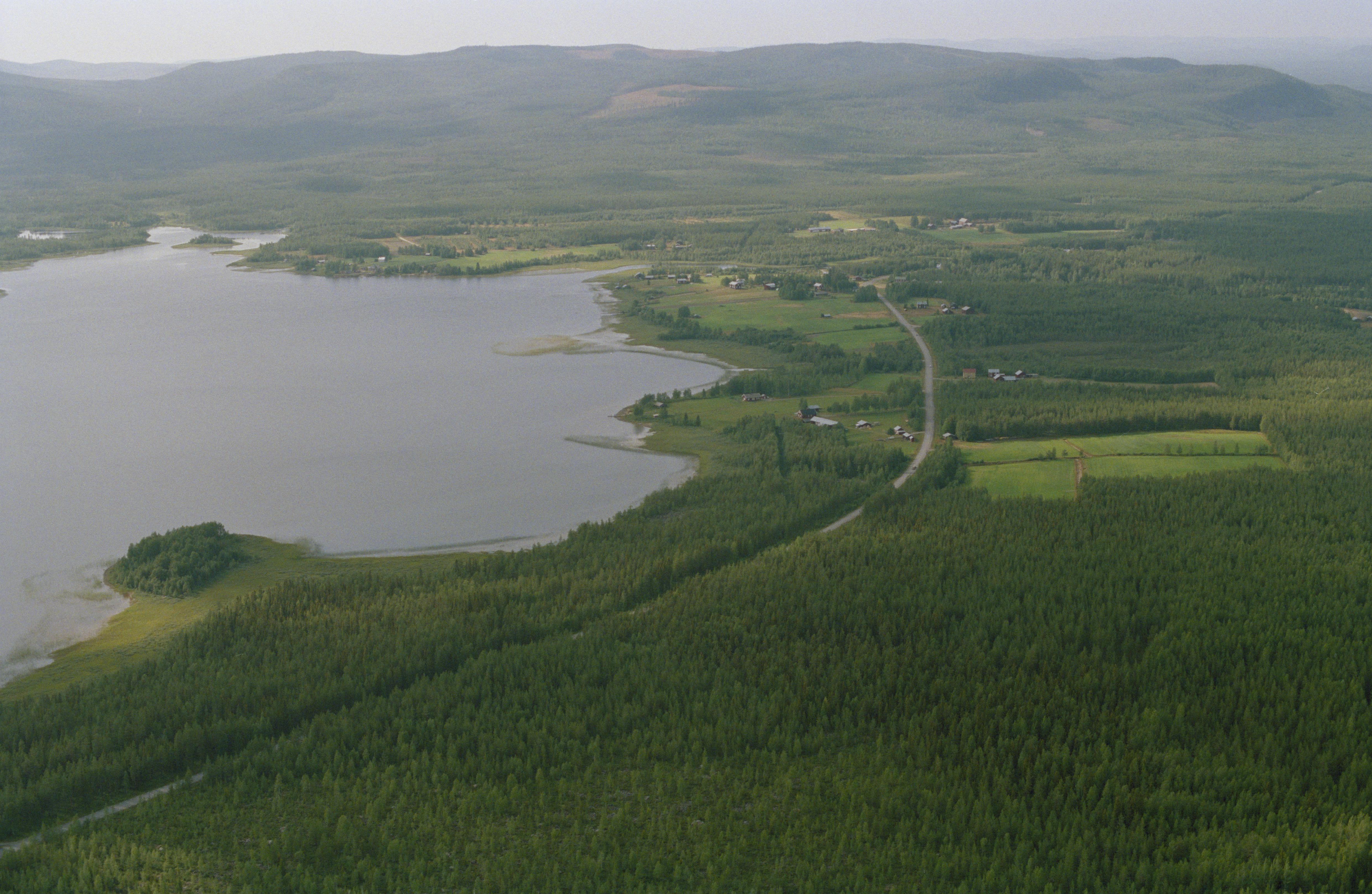 Beskrivning: Över bildens mitt Manjärvs by vid Vistån i norra delen av sjön Manjärv. I byn bytomt RAÄnr Älvsby 906:1-2. Bilden är tagen mot (väderstreck): VNV