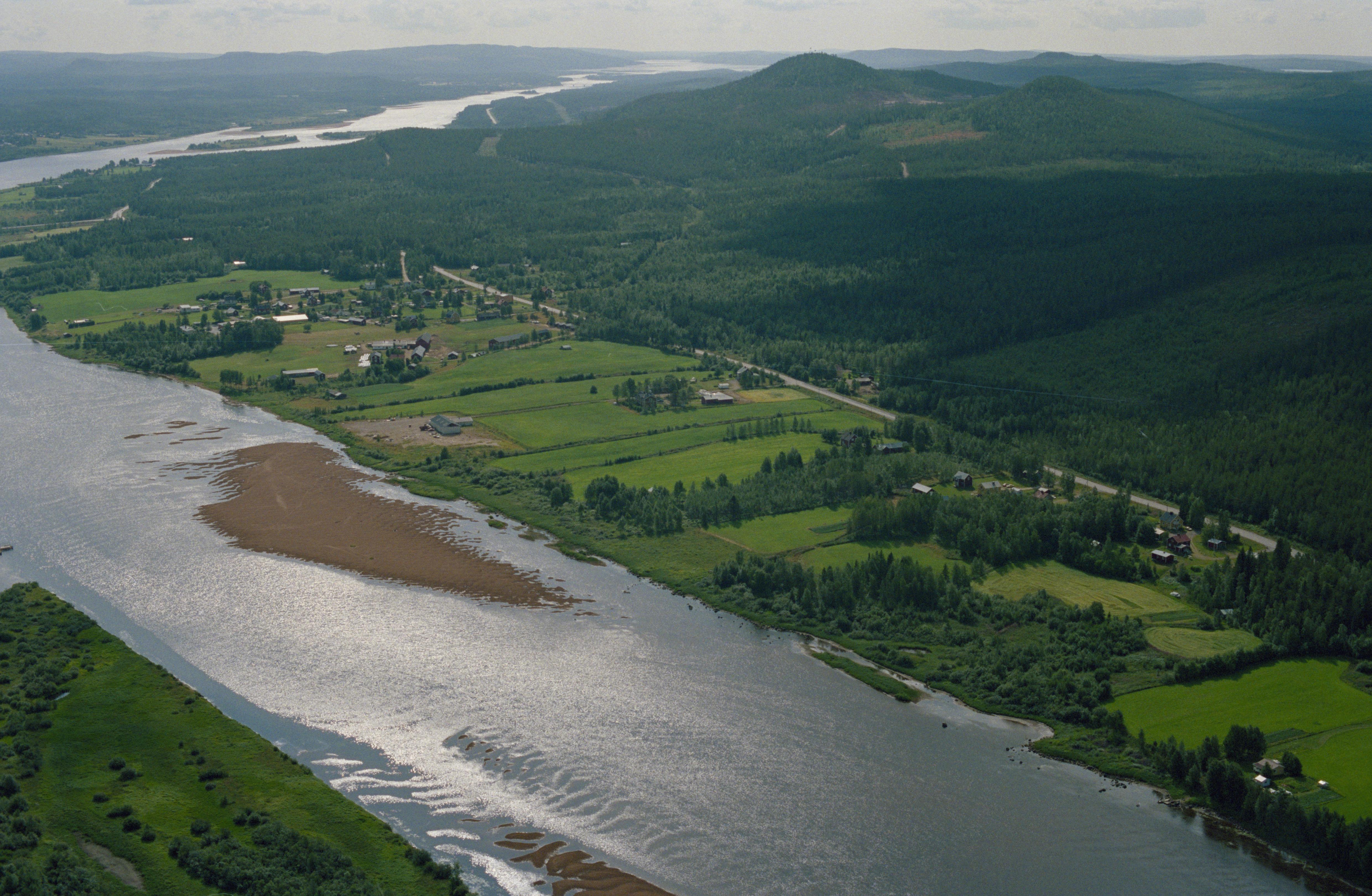Beskrivning: Ängesåns dalgång. Hedensbyn i bildens högra del. Till vänster över bildens mitt bytomt RAÄnr Överkalix 631:1. Kalixälven i bildens övre del. Bilden är tagen mot (väderstreck): S