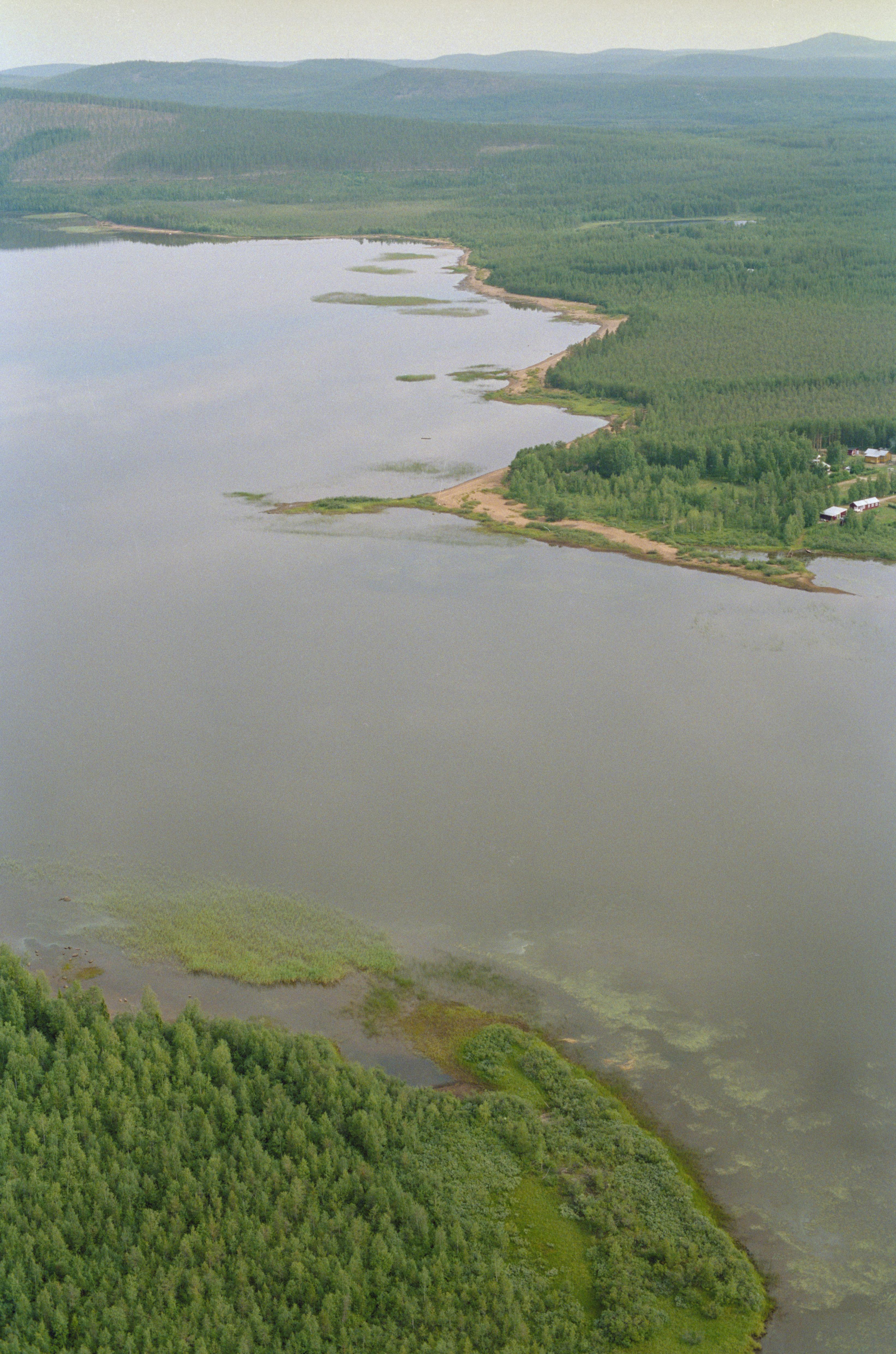 Beskrivning: I bildens nedre del norra delen av Storsundet i sjön Övre Lansjärv. Till höger över bildens mitt området Stubblandet med boplats RAÄnr Överkalix 9:1. Bilden är tagen mot (väderstreck): NNO