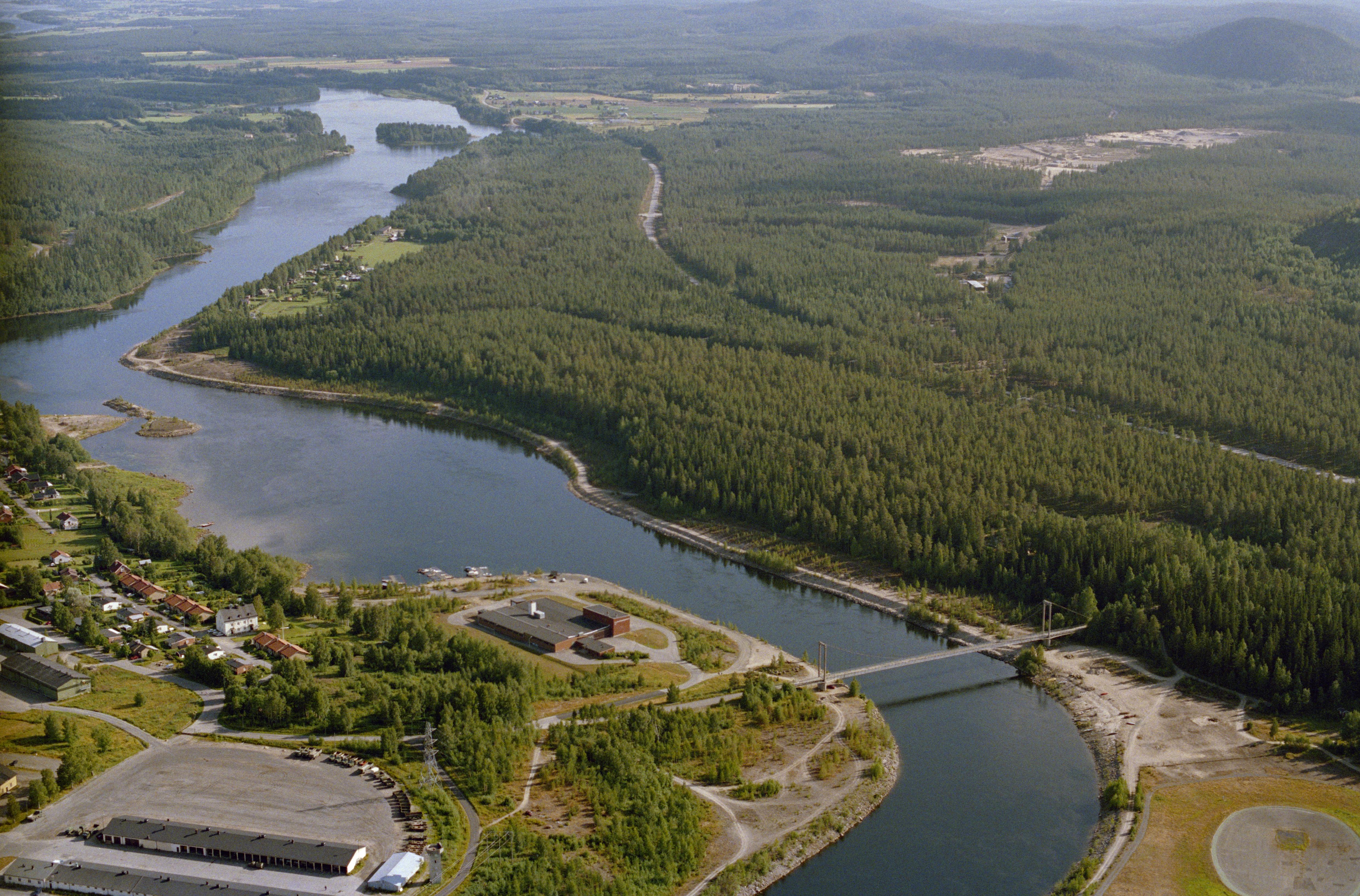 Beskrivning: Luleälven vid området Bodsvedjan i västra delen av tätorten Boden. Byggnadsminnet "Engelska kanalen" RAÄnr Överluleå 71:1 i skogen vid bildens mitt. Bilden är tagen mot (väderstreck): SV