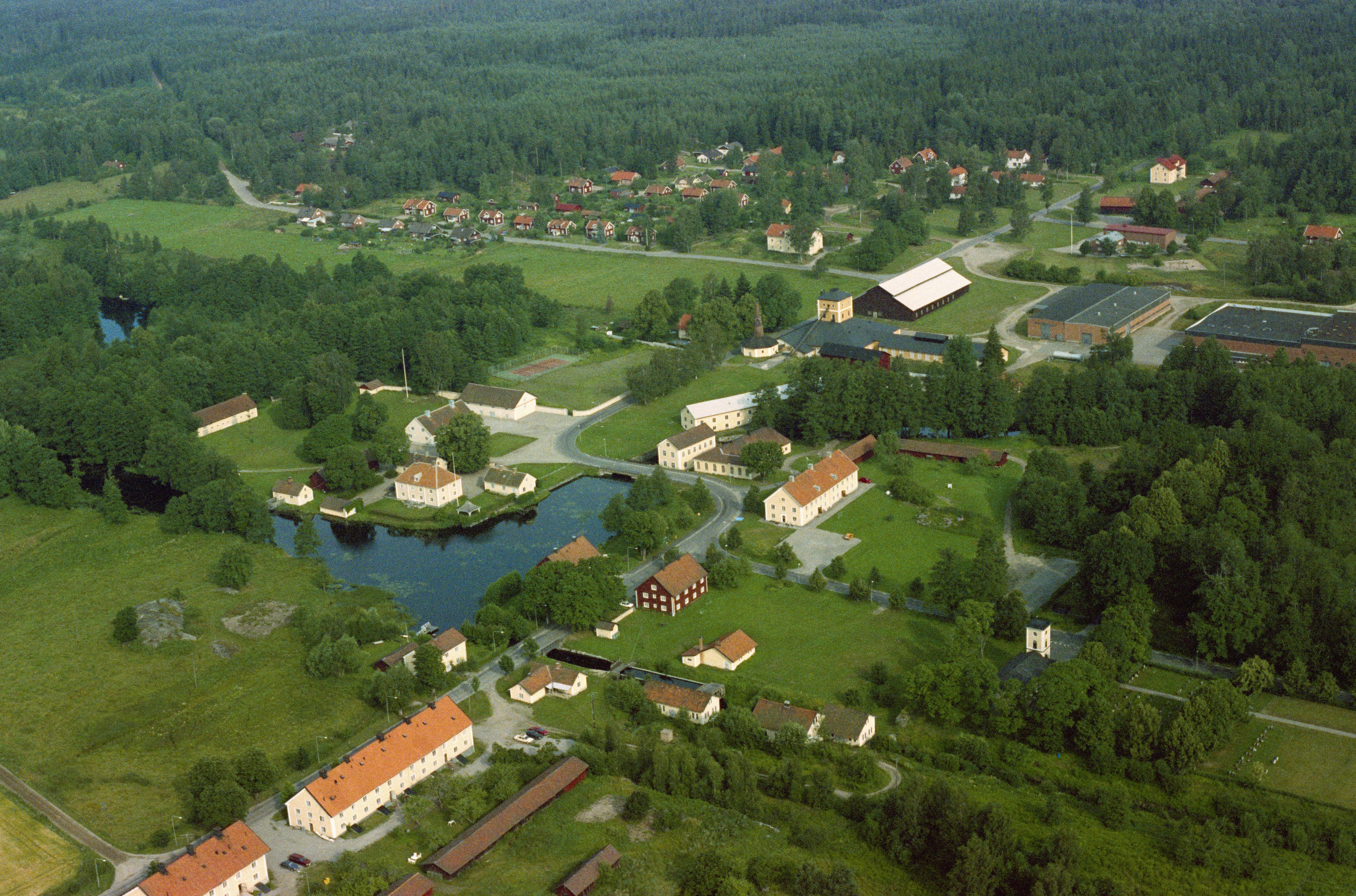 Beskrivning: Brevens bruk, hytt- och hammarområde RAÄnr Asker 258 vid Brevensån och sjöarna Botaren och Sottaren. Brevens kyrka nere till höger. Bilden är tagen mot (väderstreck): VNV