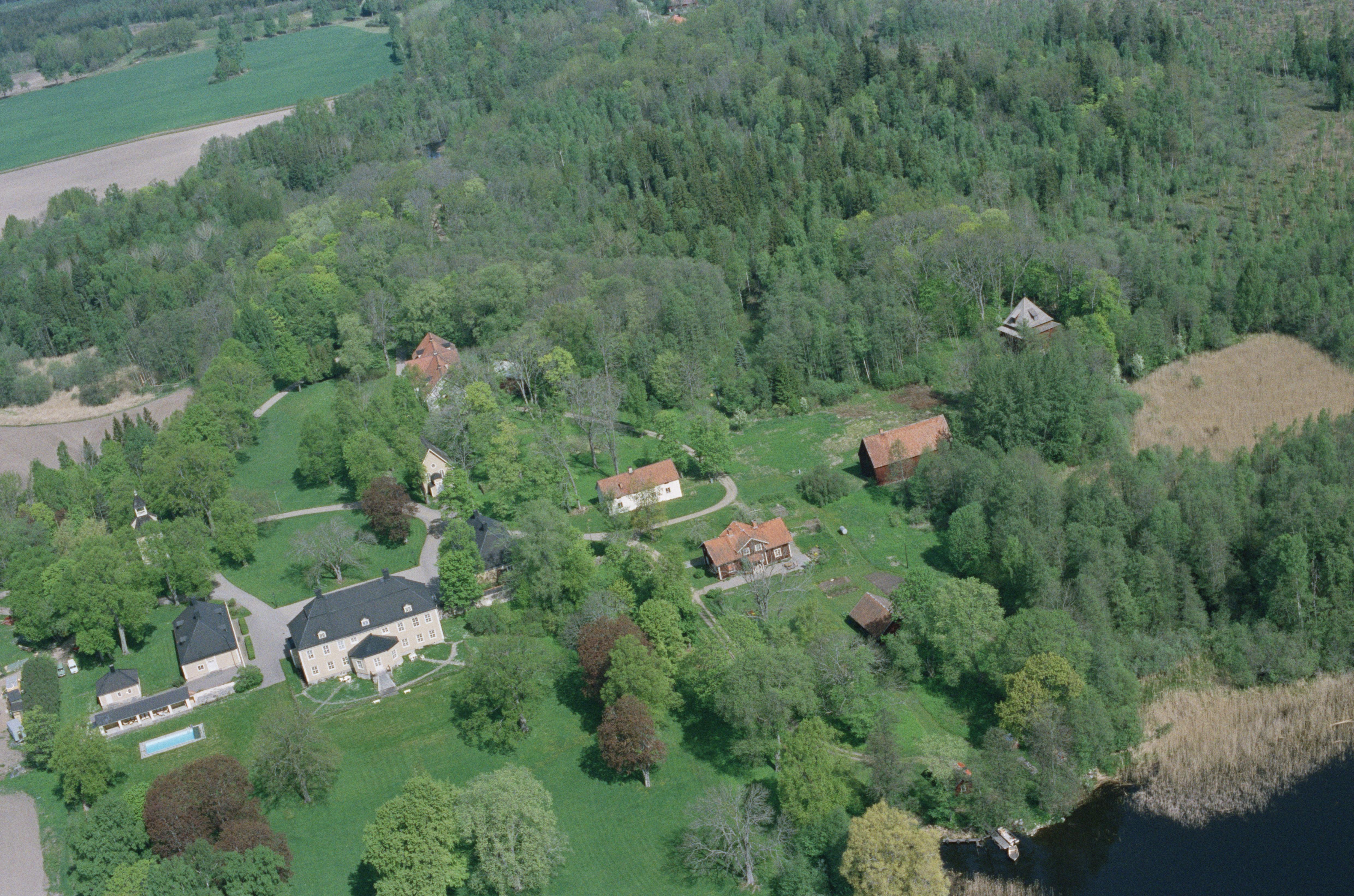 Beskrivning: Bystads herrgård fastighet Bystad 1:7 vid Bystadviken. Fatbursbyggnad uppe till höger. Bilden är tagen mot (väderstreck): N
