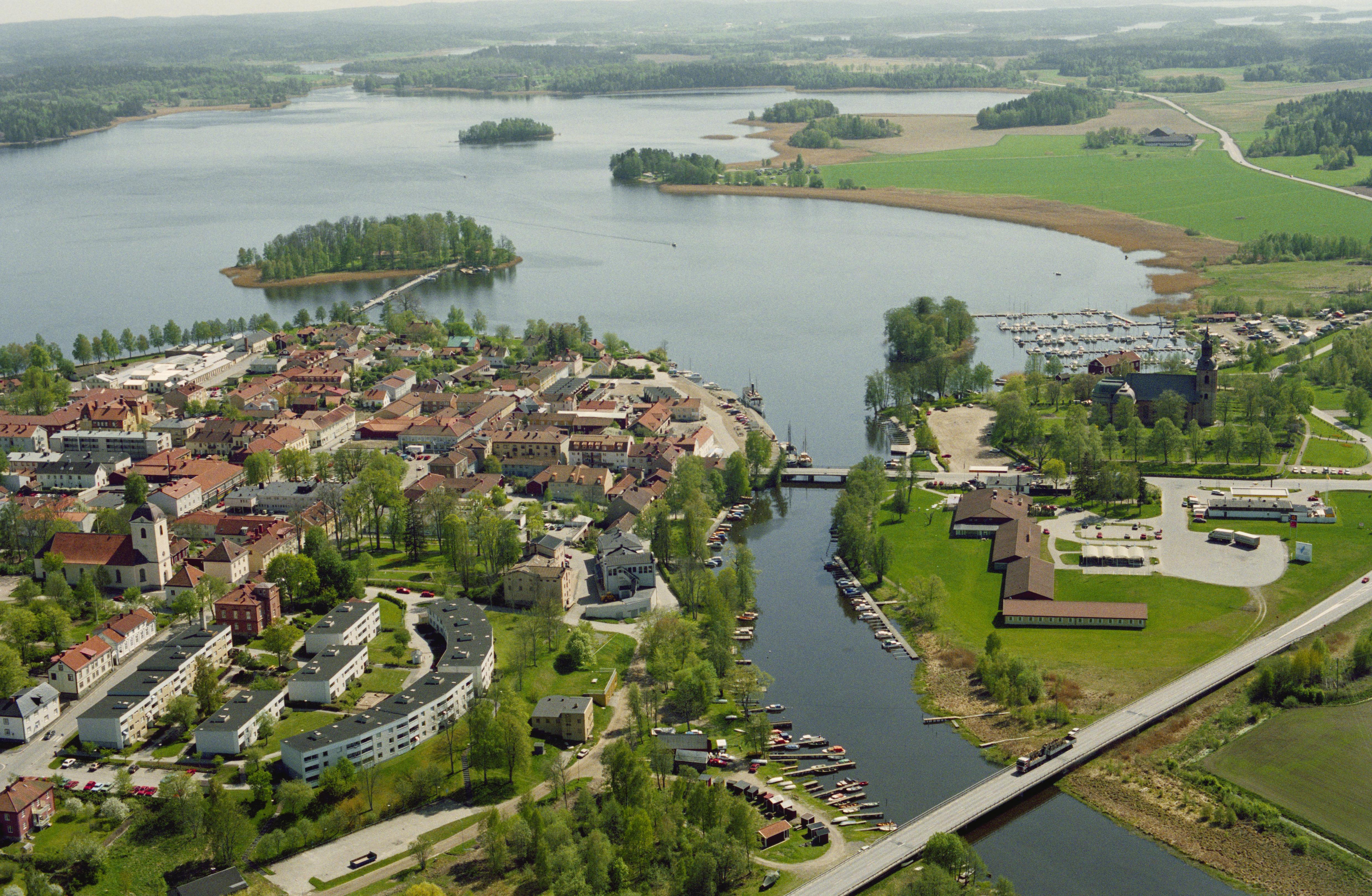 Beskrivning: Askersunds tätort vid Sundet och sjön Alsen. Sofia Magdalena kyrka till vänster och Askersunds Landskyrka till höger om bildens mitt. Bilden är tagen mot (väderstreck): S