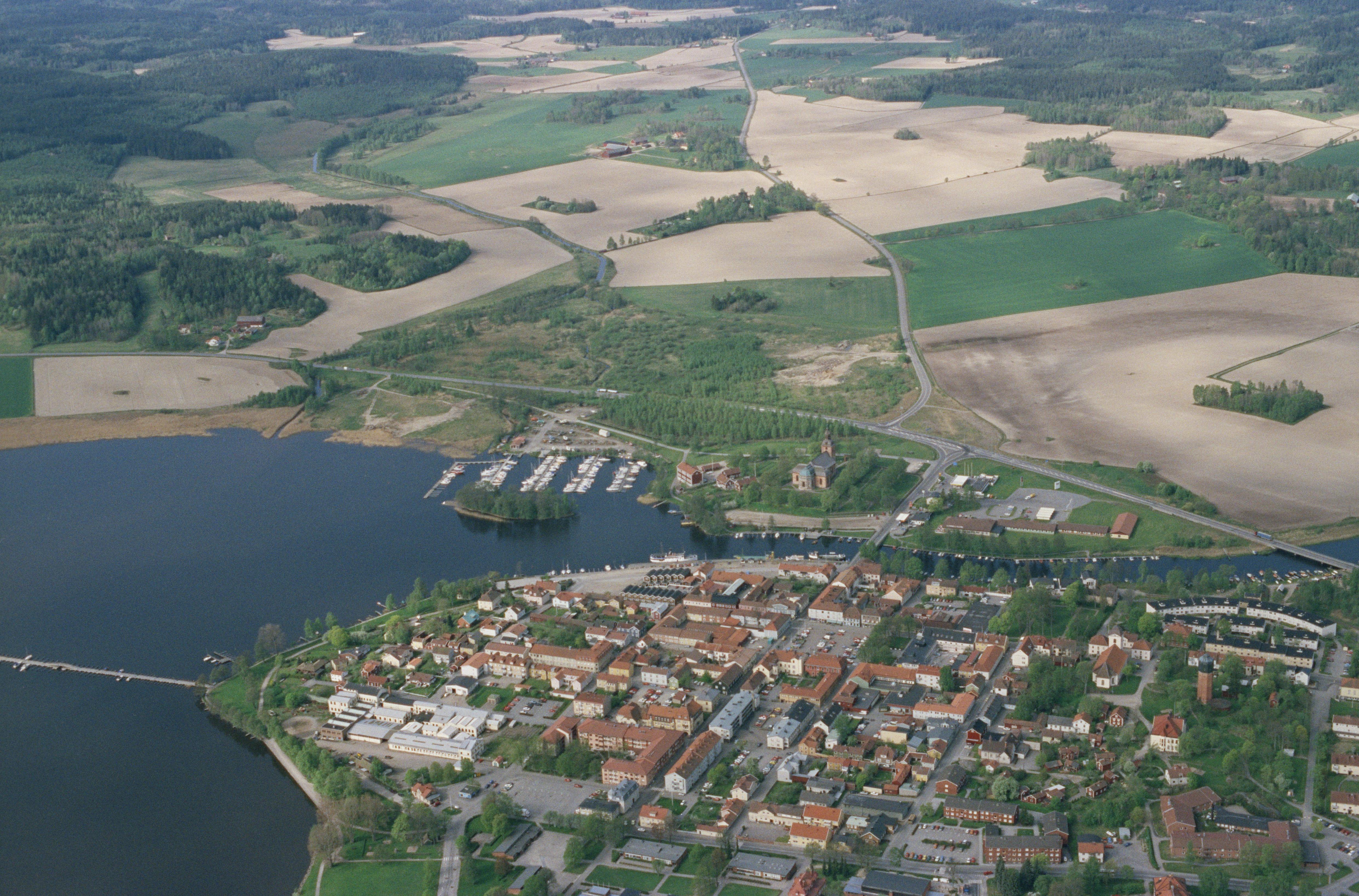 Beskrivning: Askersunds tätort vid Sundet och sjön Alsen. Askersunds Landskyrka och Sofia Magdalena kyrka till höger om bildens mitt. Bilden är tagen mot (väderstreck): V