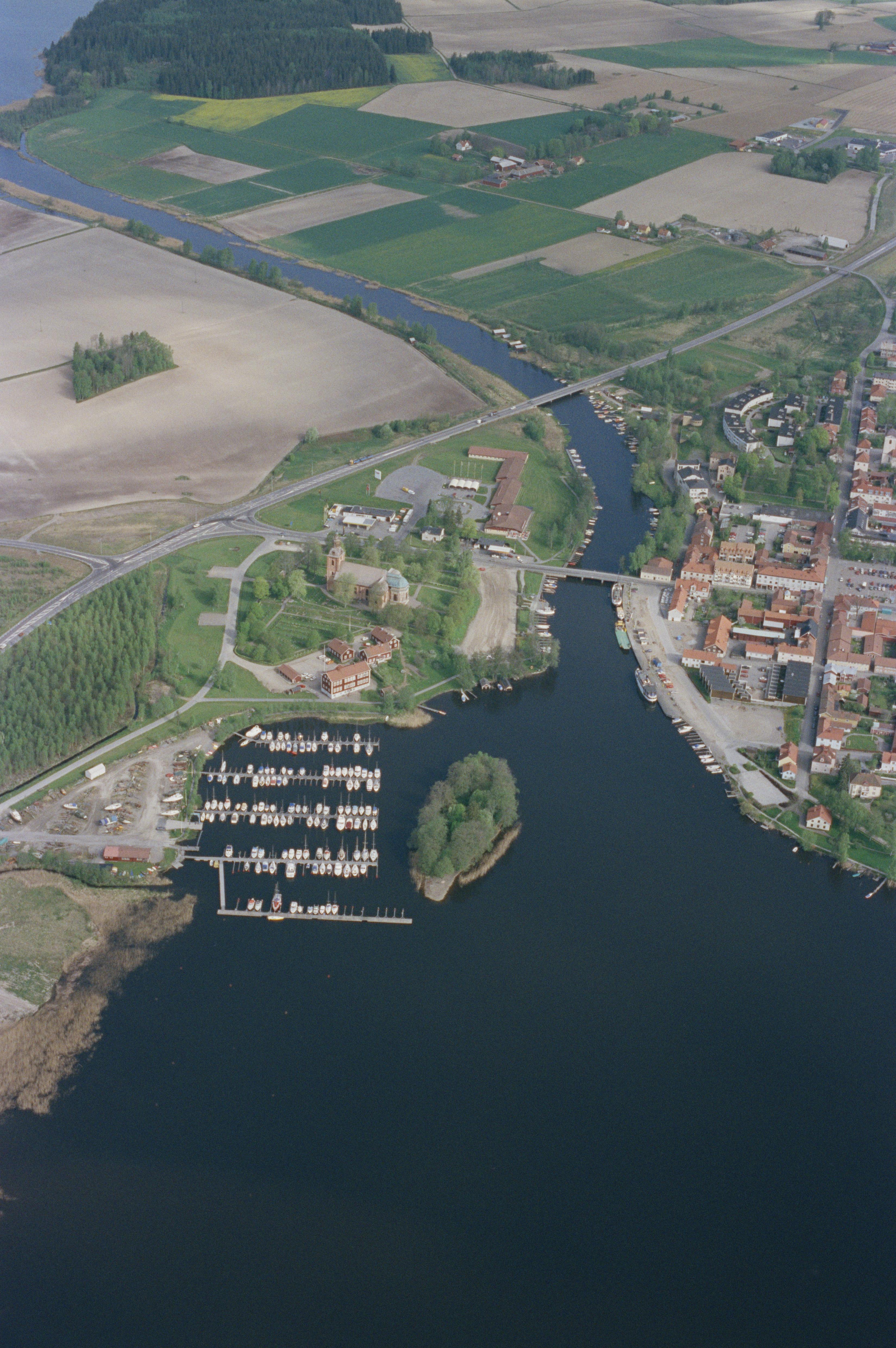 Beskrivning: Askersunds tätort vid Sundet och sjön Alsen. Askersunds Landskyrka vid bildens mitt. Bilden är tagen mot (väderstreck): NNV