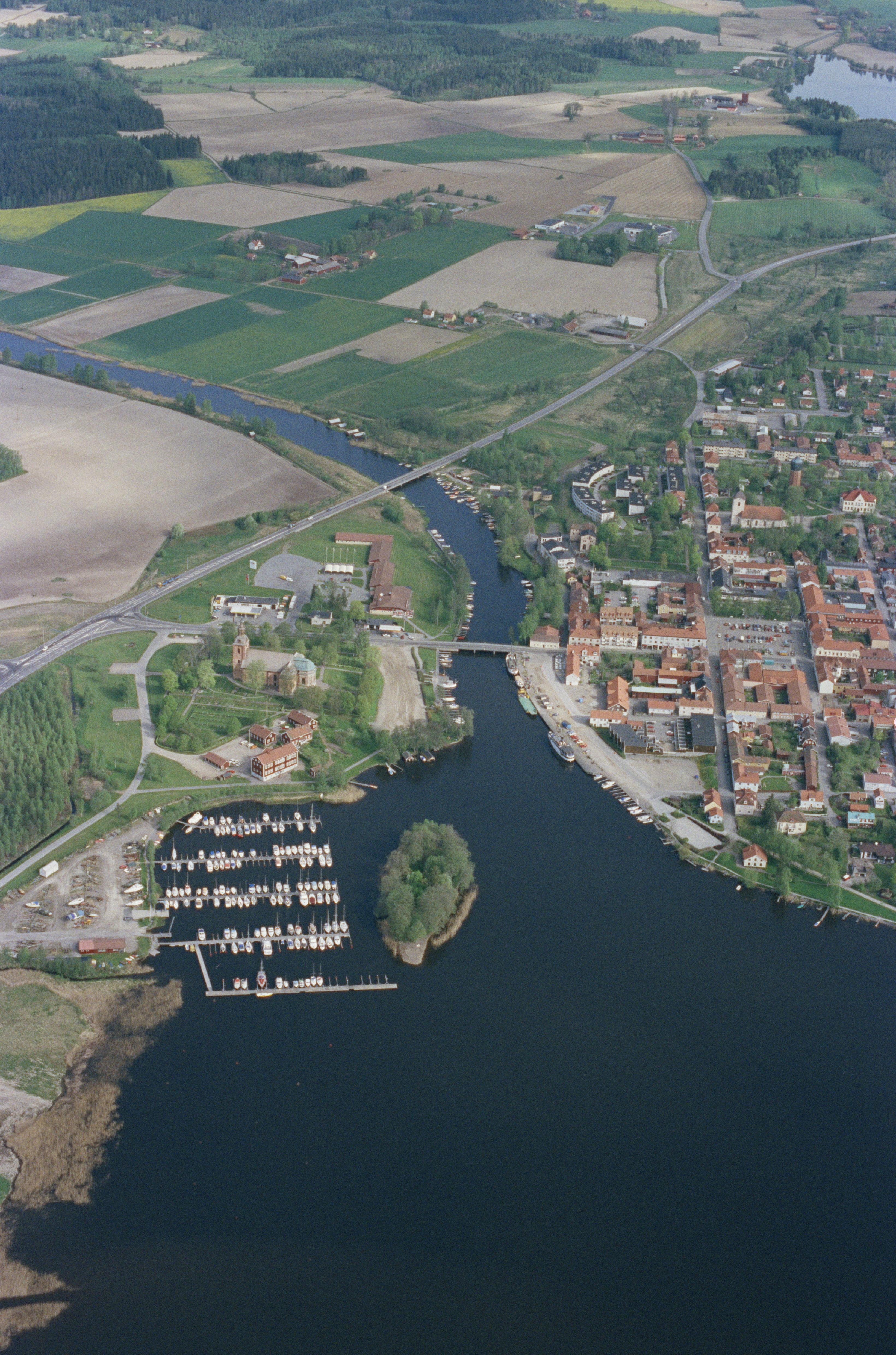 Beskrivning: Askersunds tätort vid Sundet och sjön Alsen. Askersunds Landskyrka vid bildens mitt. Bilden är tagen mot (väderstreck): NNV