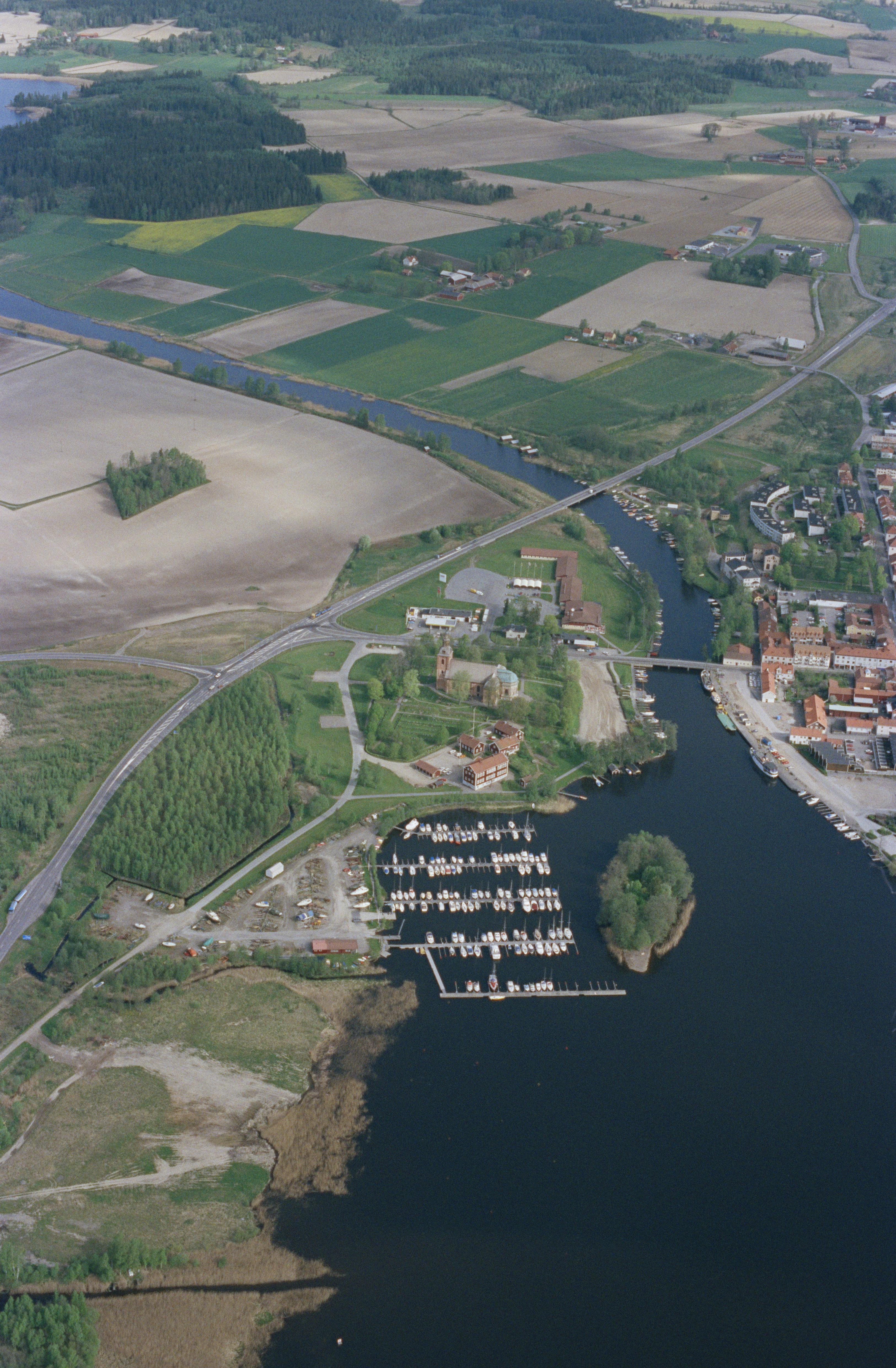 Beskrivning: Askersunds tätort vid Sundet och sjön Alsen. Askersunds Landskyrka vid bildens mitt. Bilden är tagen mot (väderstreck): NNV