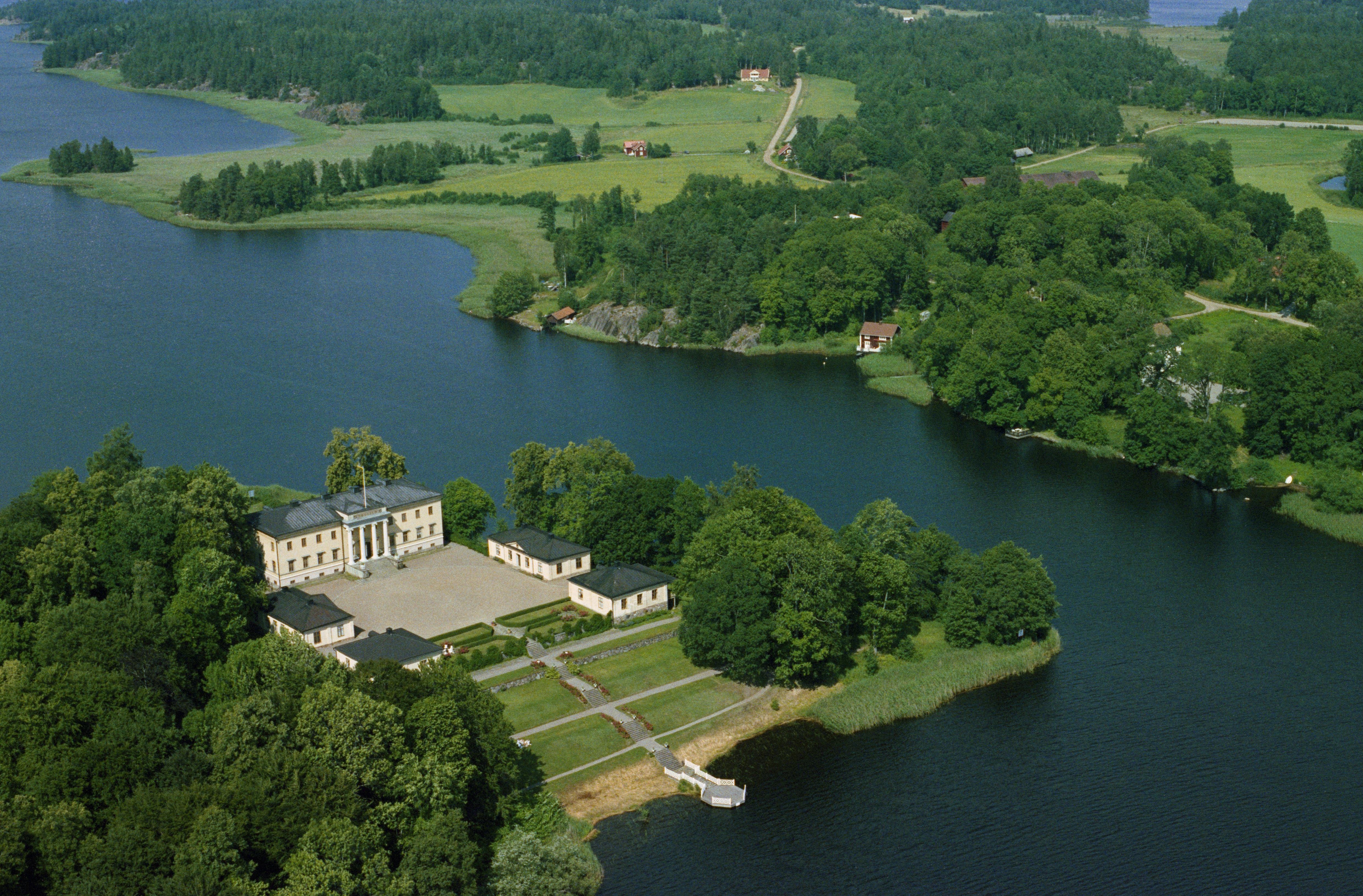 Beskrivning: Till vänster Stjernsunds slott (skrivs även Stjärnsunds slott) byggnadsminne Askersund 5:1 vid sjön Alsen. Till höger Edö herrgård. Bilden är tagen mot (väderstreck): N