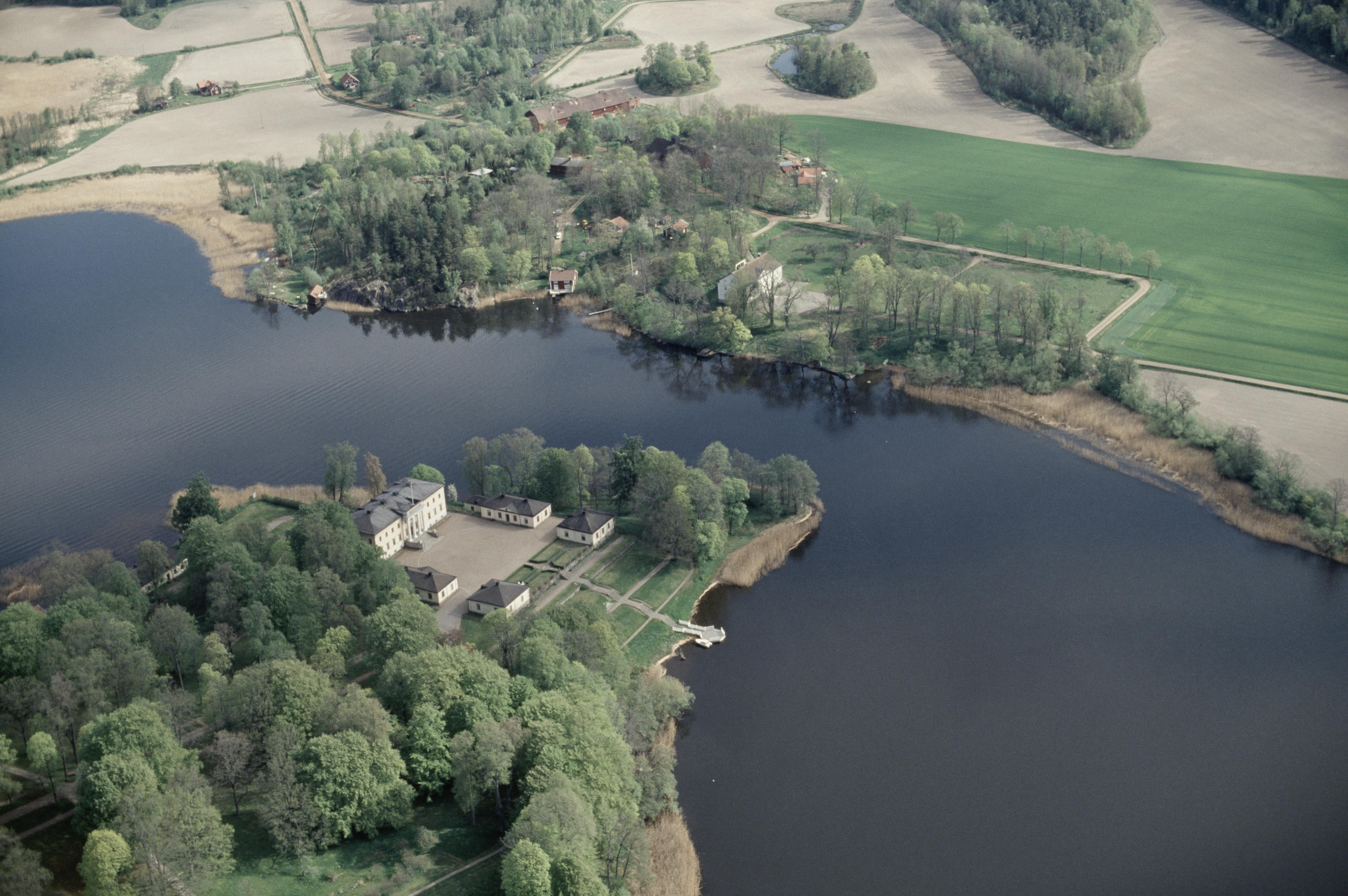Beskrivning: Till vänster Stjernsunds slott (skrivs även Stjärnsunds slott) byggnadsminne Askersund 5:1 vid sjön Alsen. I bildens övre del Edö herrgård. Bilden är tagen mot (väderstreck): NO
