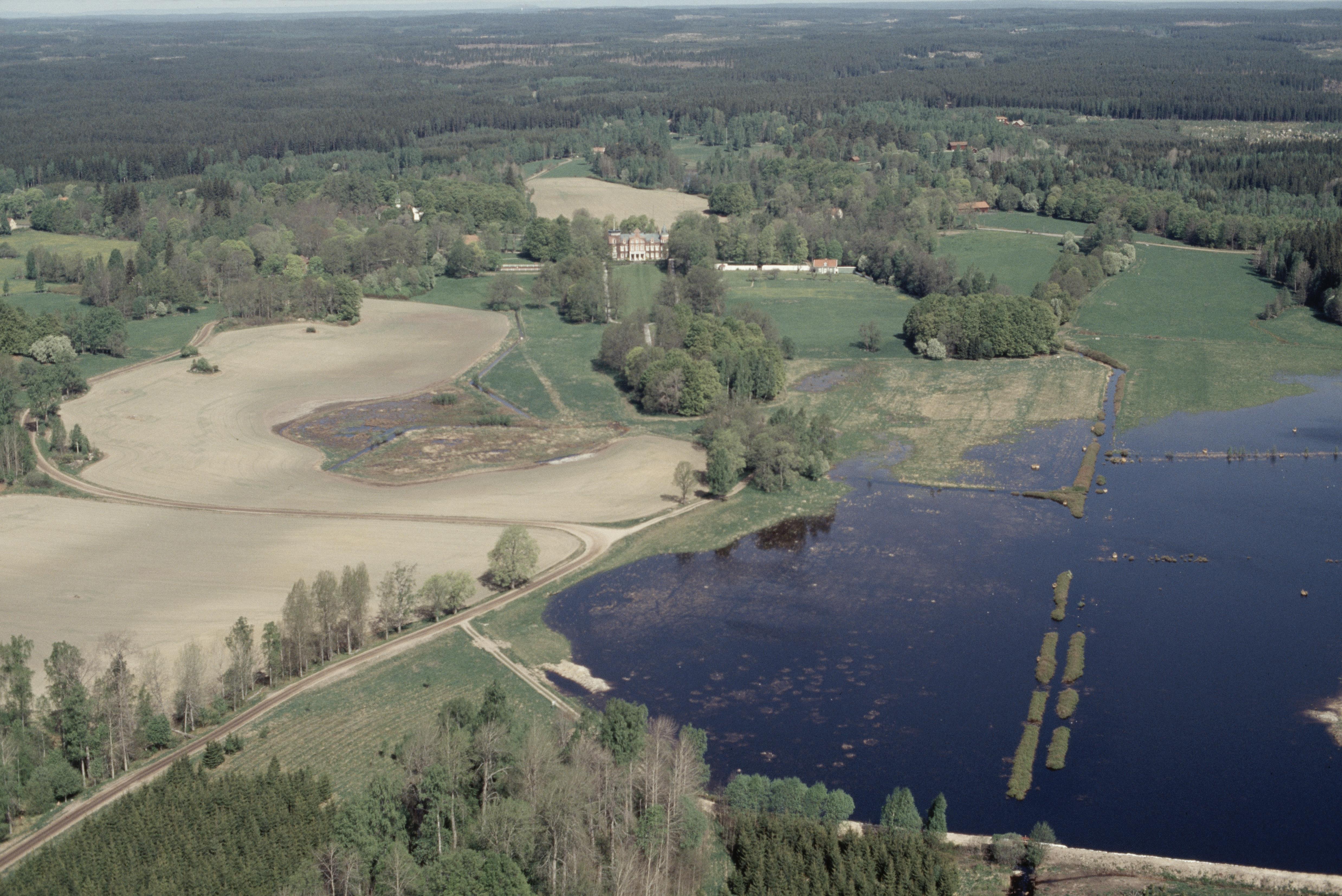 Beskrivning: Boo fideikommiss / Boo slott RAÄnr Bo 51:1 vid Bosån. Boo Gårdskyrka uppe till vänster. Bilden är tagen mot (väderstreck): NV