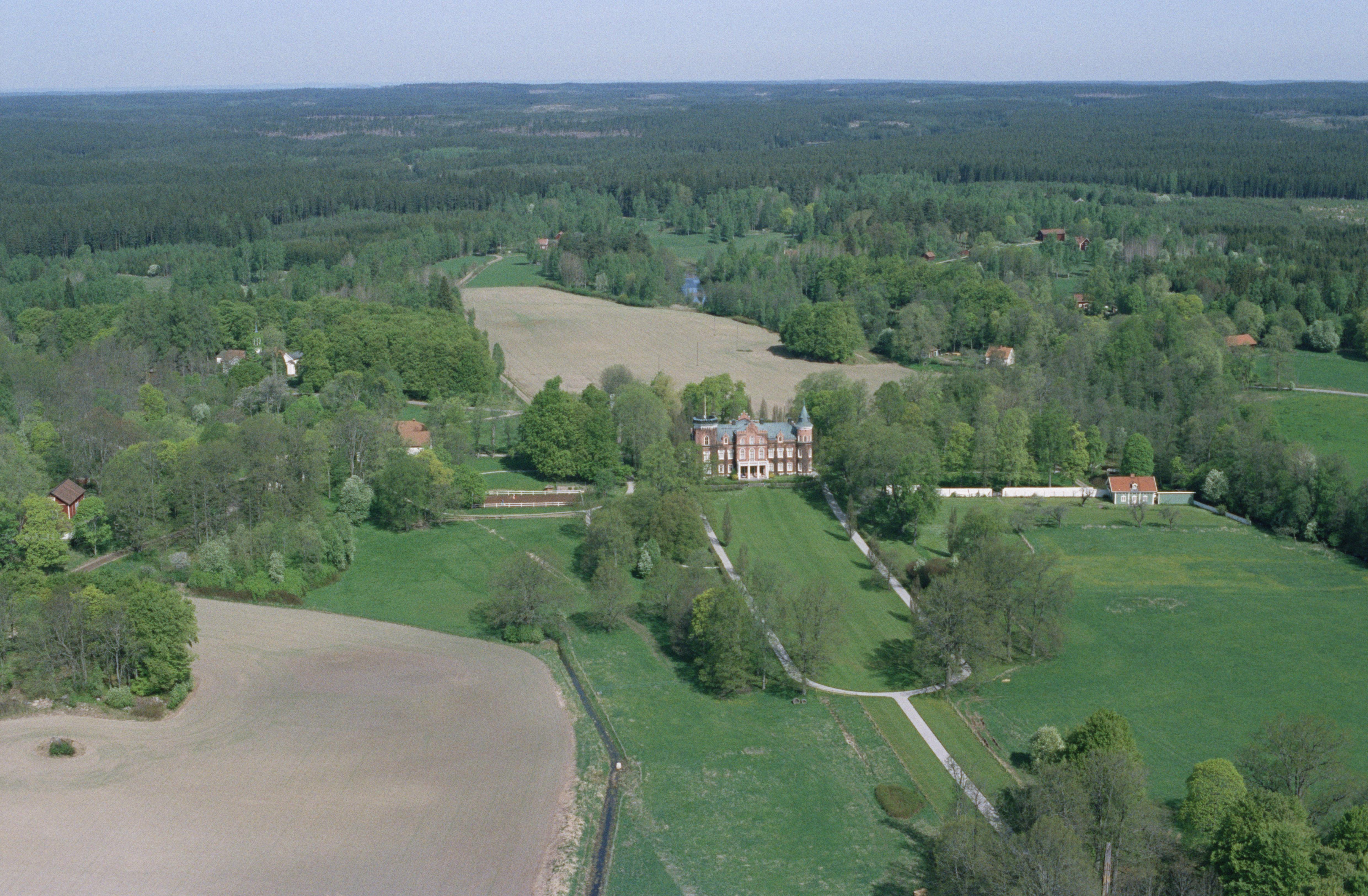 Beskrivning: Boo fideikommiss / Boo slott RAÄnr Bo 51:1 vid Bosån. Boo Gårdskyrka uppe till vänster. Bilden är tagen mot (väderstreck): NNV