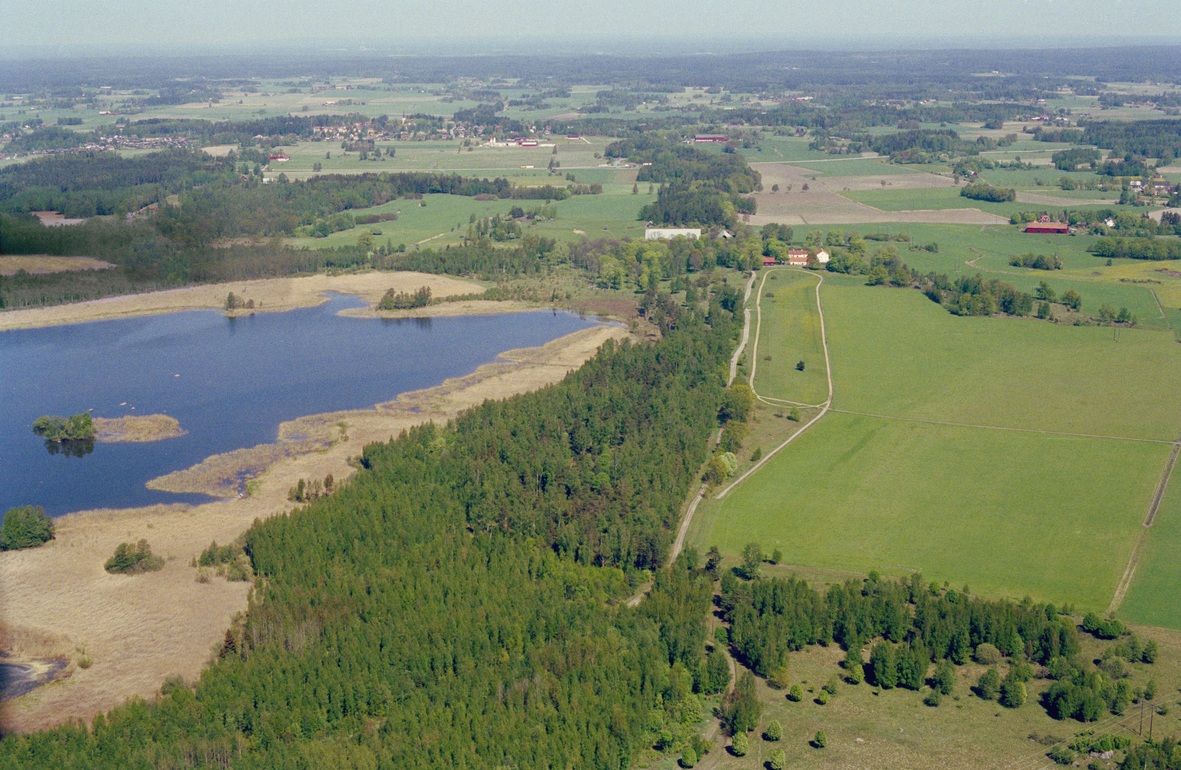 Beskrivning: Gravfält RAÄnr Glanshammar 2:1 nere till vänster. Skävesunds herrgård vid sjön Hjälmaren i bildens övre del. Bilden är tagen mot (väderstreck): N
