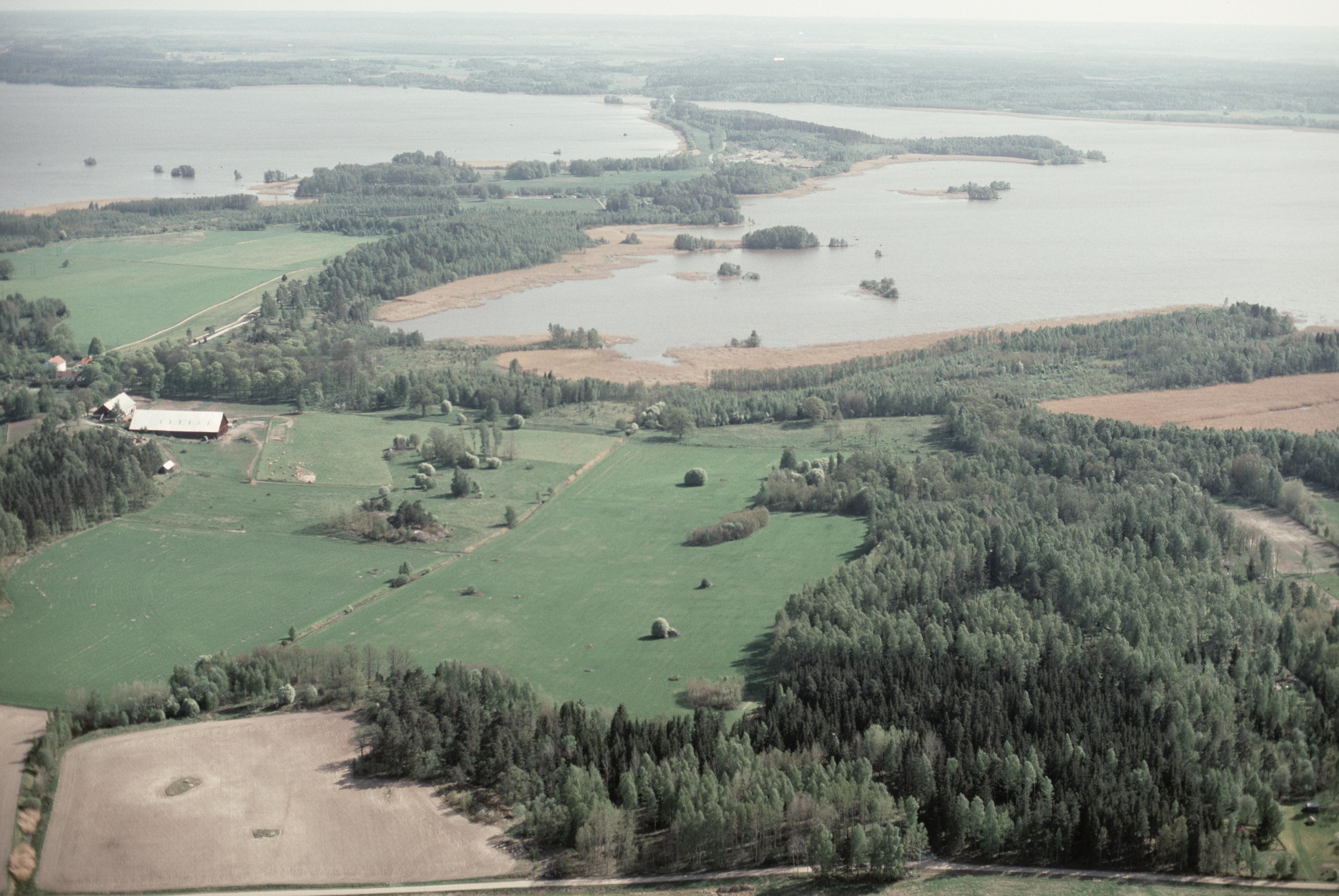 Beskrivning: Skävesunds herrgård vid sjön Hjälmaren. Gubbskogen med gravfält RAÄnr Glanshammar 2:1 och Norra Skäret vid bildens mitt. På udden i bildens övre del Äsön i Stora Mellösa socken. Bilden är tagen mot (väderstreck): S