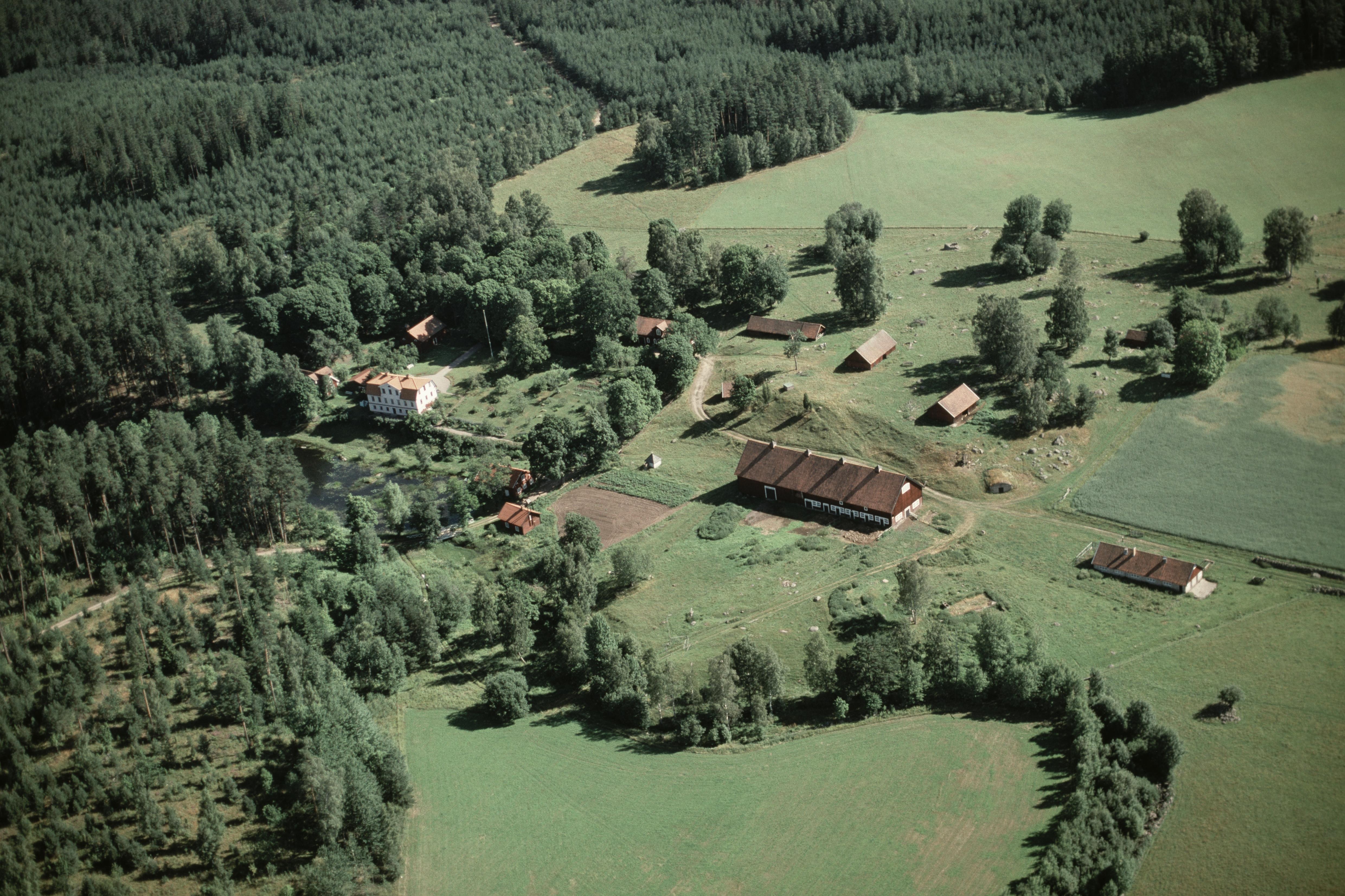 Norrby herrgård. Gravfält RAÄnr Asby 118:1 i bildens högra del. Bilden är tagen mot (väderstreck): NO