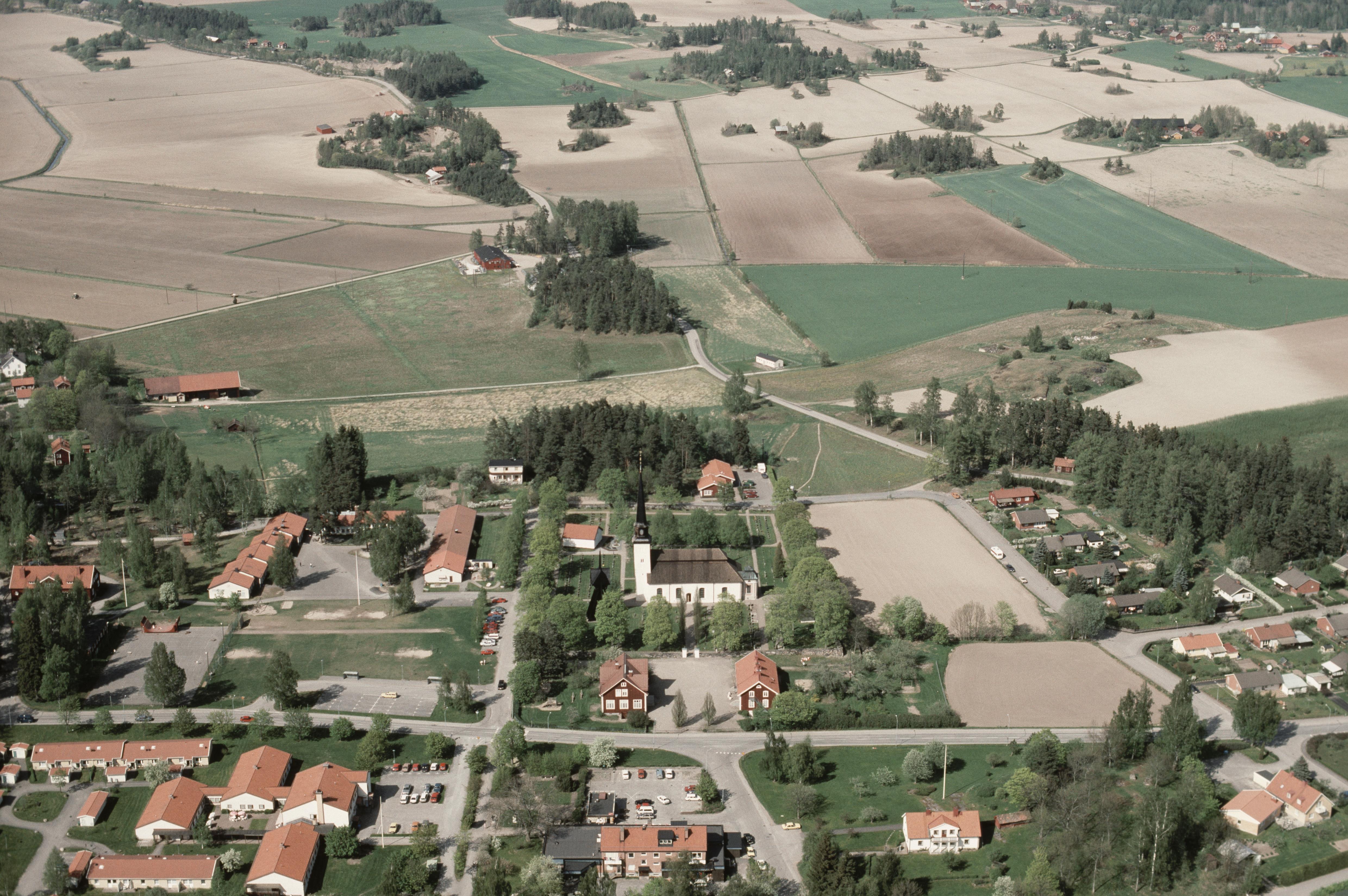 Beskrivning: Glanshammars tätort. Glanshammars kyrka under bildens mitt. Bilden är tagen mot (väderstreck): NNO