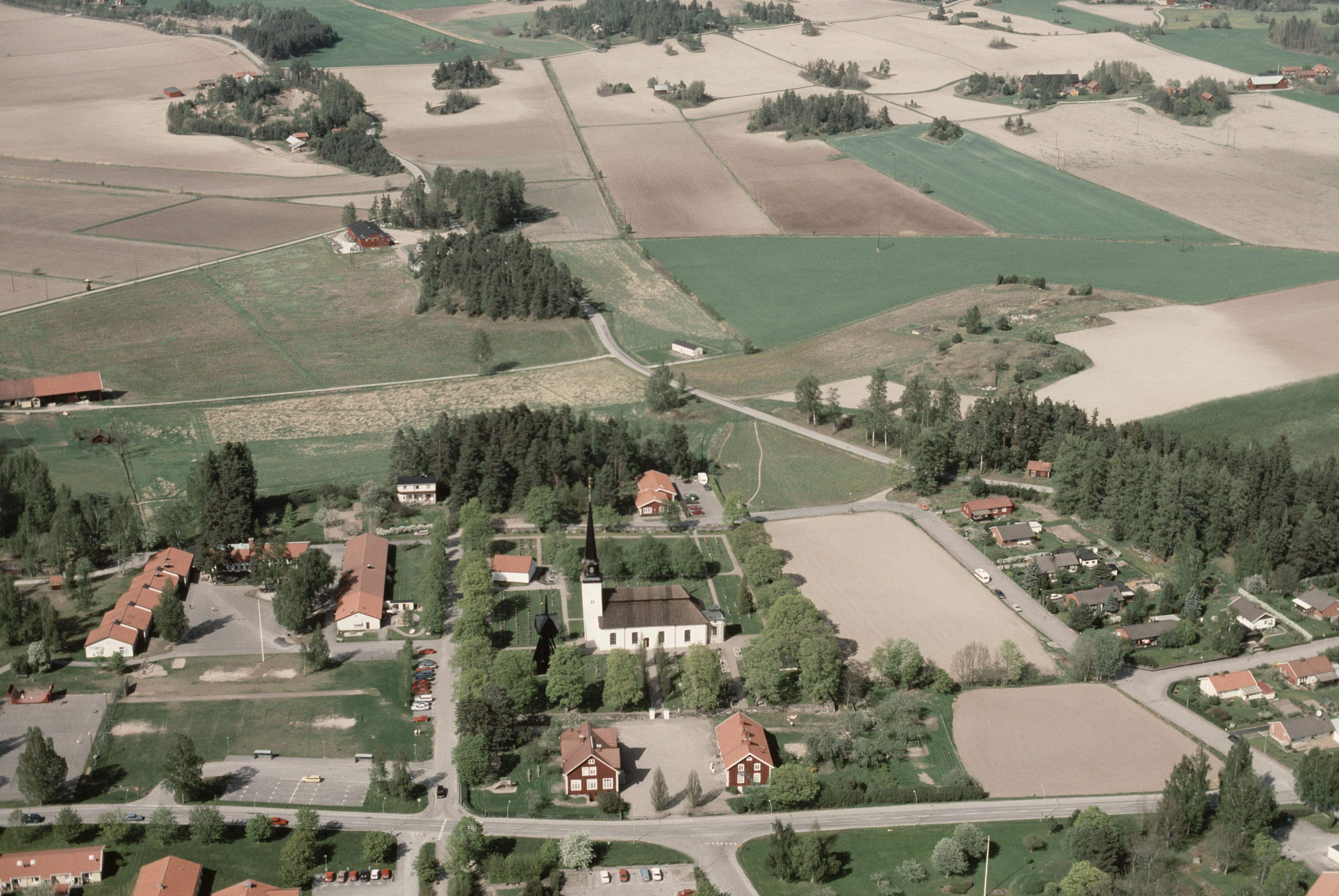 Beskrivning: Glanshammars tätort. Glanshammars kyrka under bildens mitt. Bilden är tagen mot (väderstreck): NNO