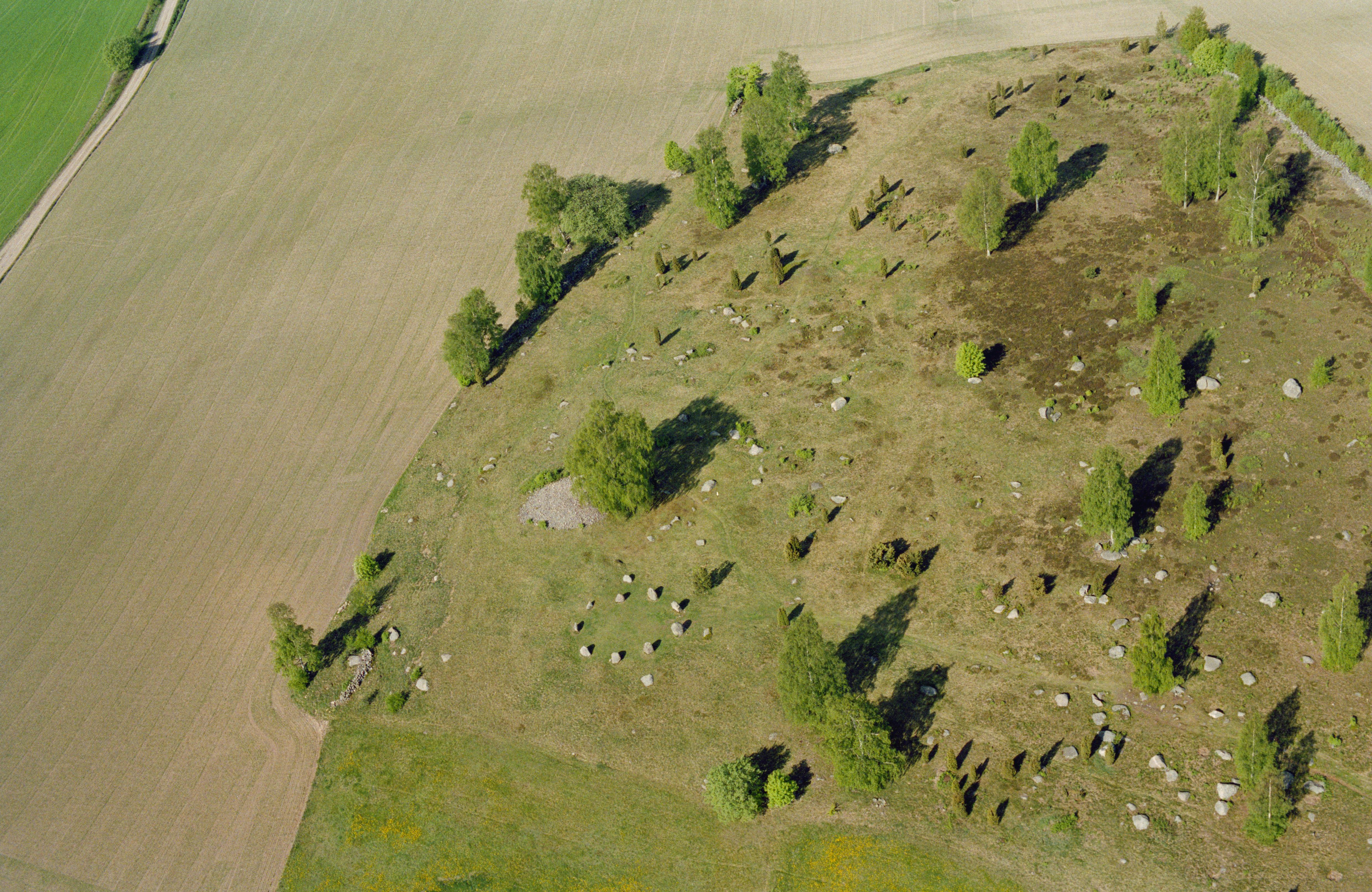 Beskrivning: Fossil åker och gravfält Lekebacken RAÄnr Kumla 35:1-2 i Hjortsberga by. Bilden är tagen mot (väderstreck): SV
