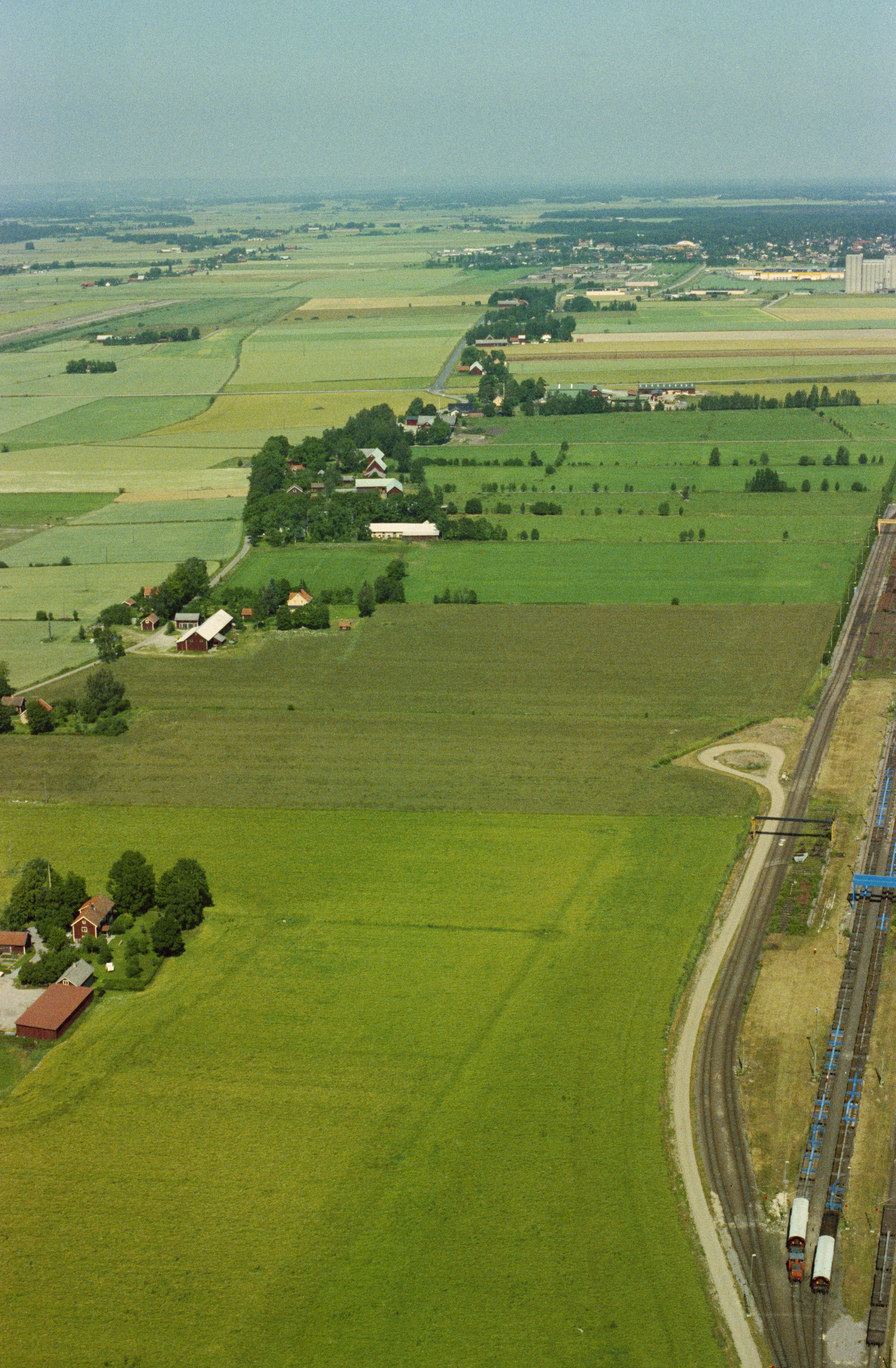 Beskrivning: Radbyn Rösavi. Gravfält RAÄnr Kumla 40:1 till vänster över bildens mitt. I bildens övre del Via, Viaskogen och tätorten Kumla. Bilden är tagen mot (väderstreck): N