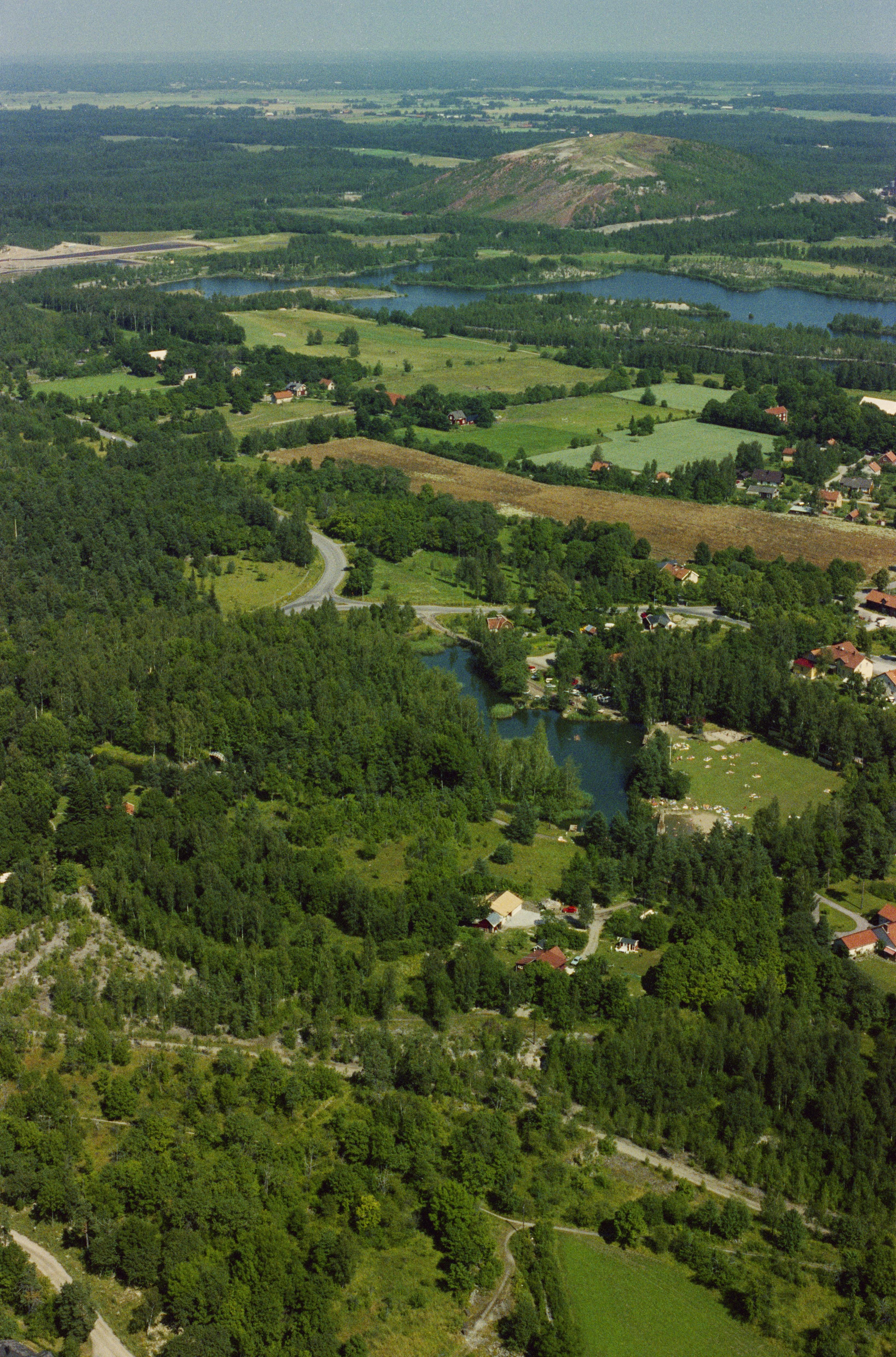 Beskrivning: Kvarntorp vid Hällkistan. Vid bildens mitt grav RAÄnr Kumla 163:1. I bildens övre del Ekeby socken med sjöarna Nordsjön och Söderhavet vid Kvarntorpshögen. Bilden är tagen mot (väderstreck): NO