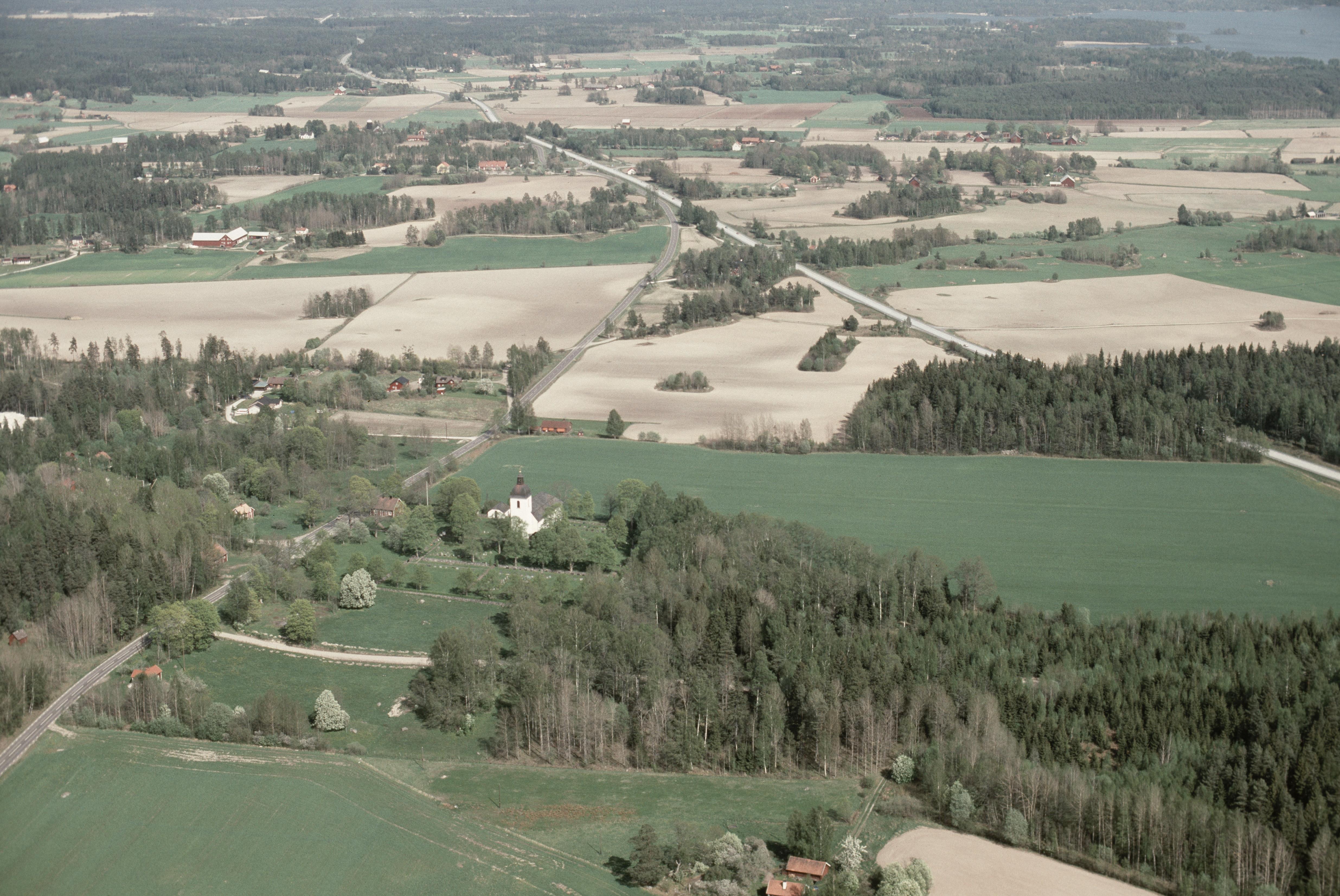 Beskrivning: Gamla och nya väg E18 vid Lillkyrka kyrka. Bilden är tagen mot (väderstreck): Ö