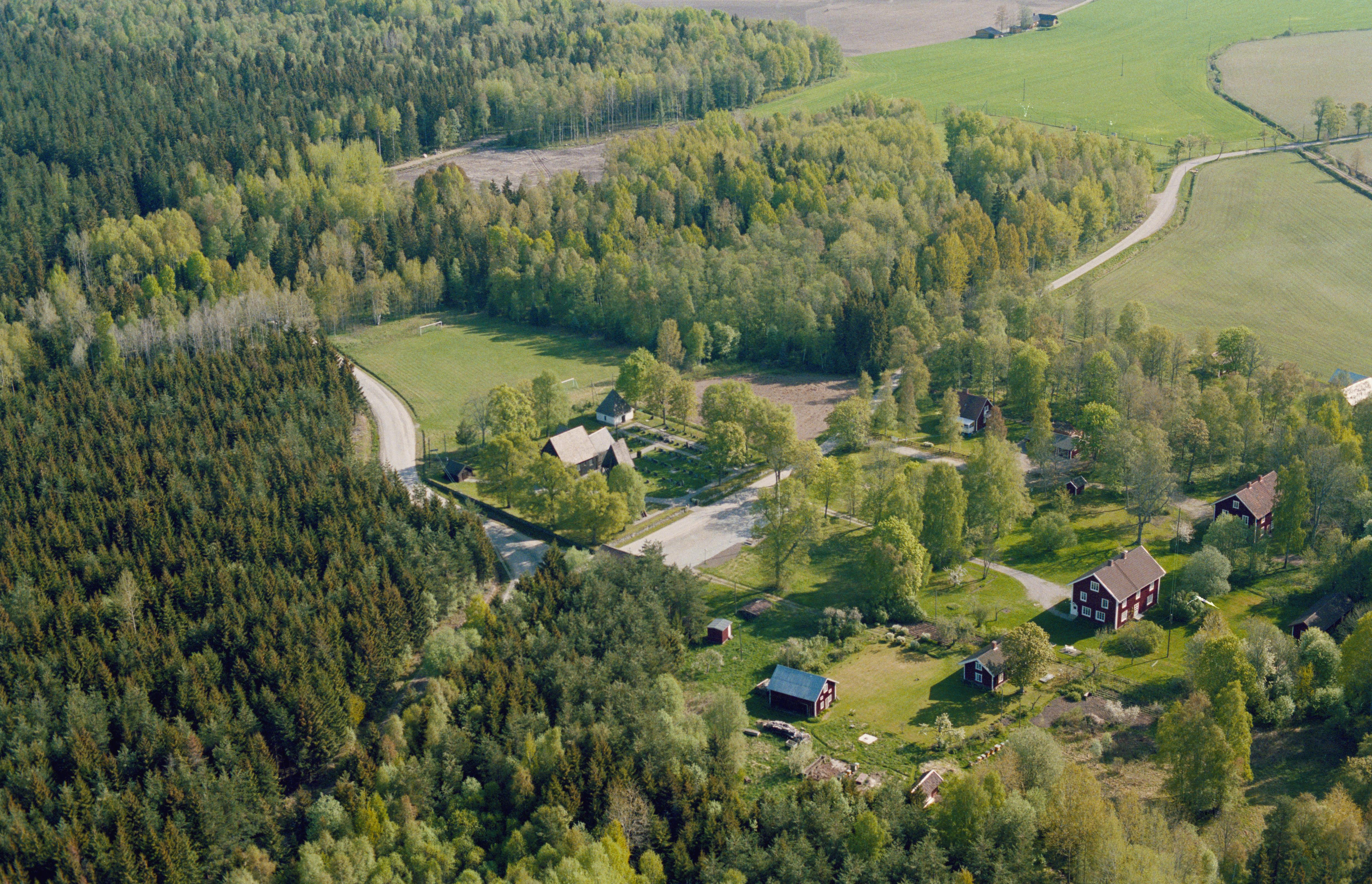 Beskrivning: Tångeråsa kyrka till vänster och Tångeråsa klockaregård till höger. Bilden är tagen mot (väderstreck): NO