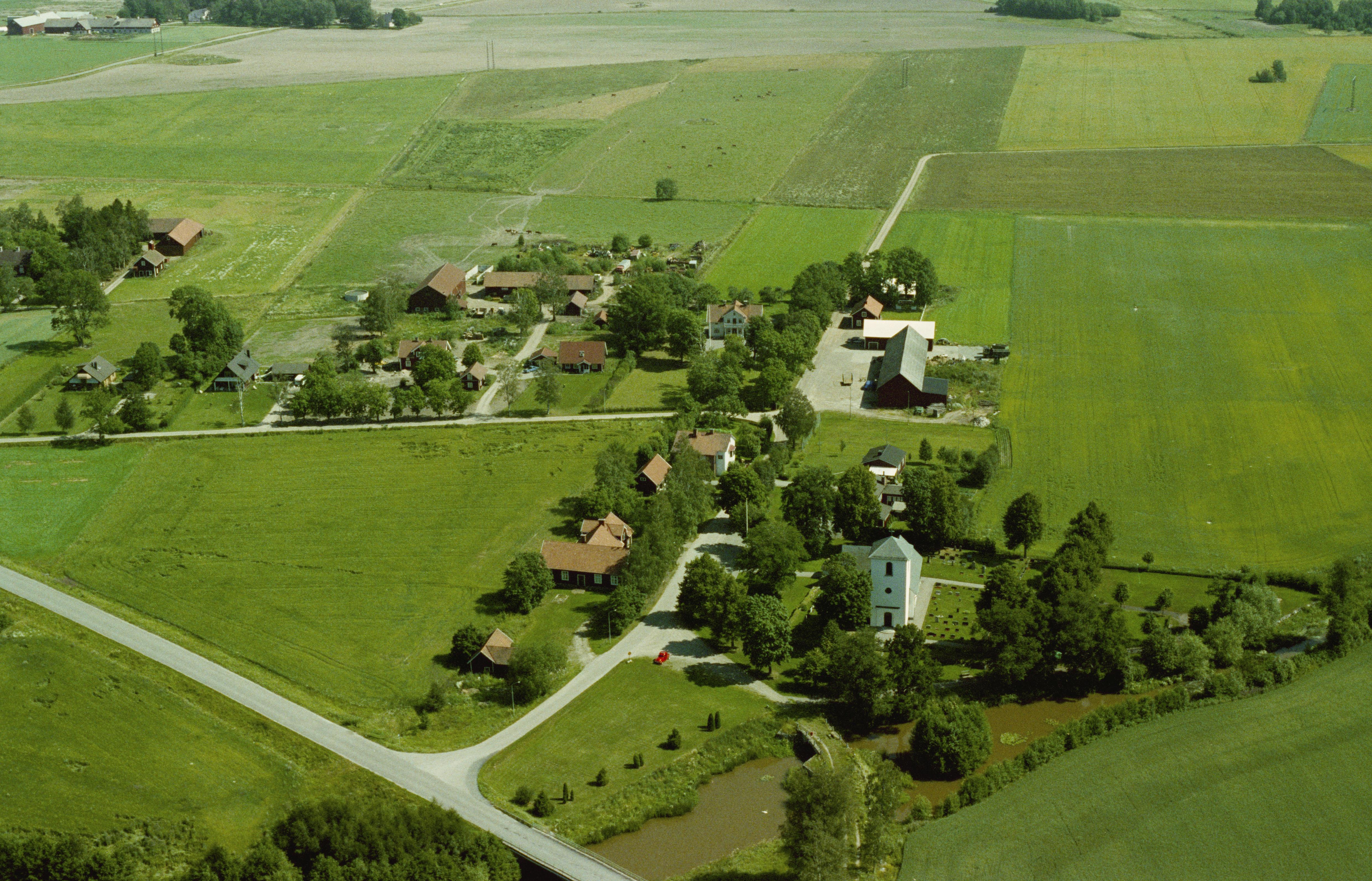Beskrivning: Täby kyrka och kyrkby vid Täljeån. Bilden är tagen mot (väderstreck): Ö