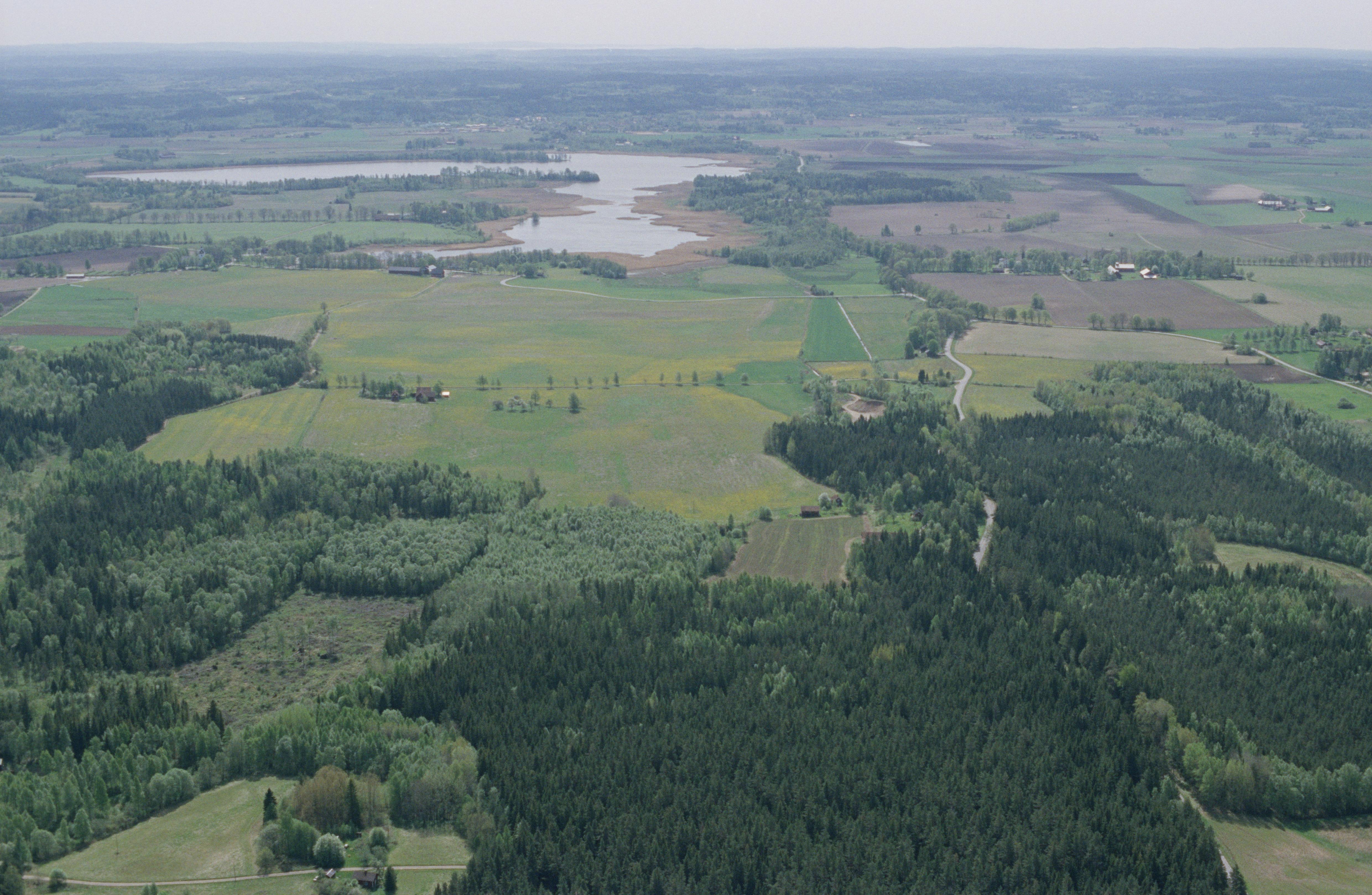 Beskrivning: Gravfält RAÄnr Viby 11:1 vid bildens mitt. Till vänster i bildens övre del Viby kyrka och Körtingsbergs herrgård vid Vibysjön. Bilden är tagen mot (väderstreck): S