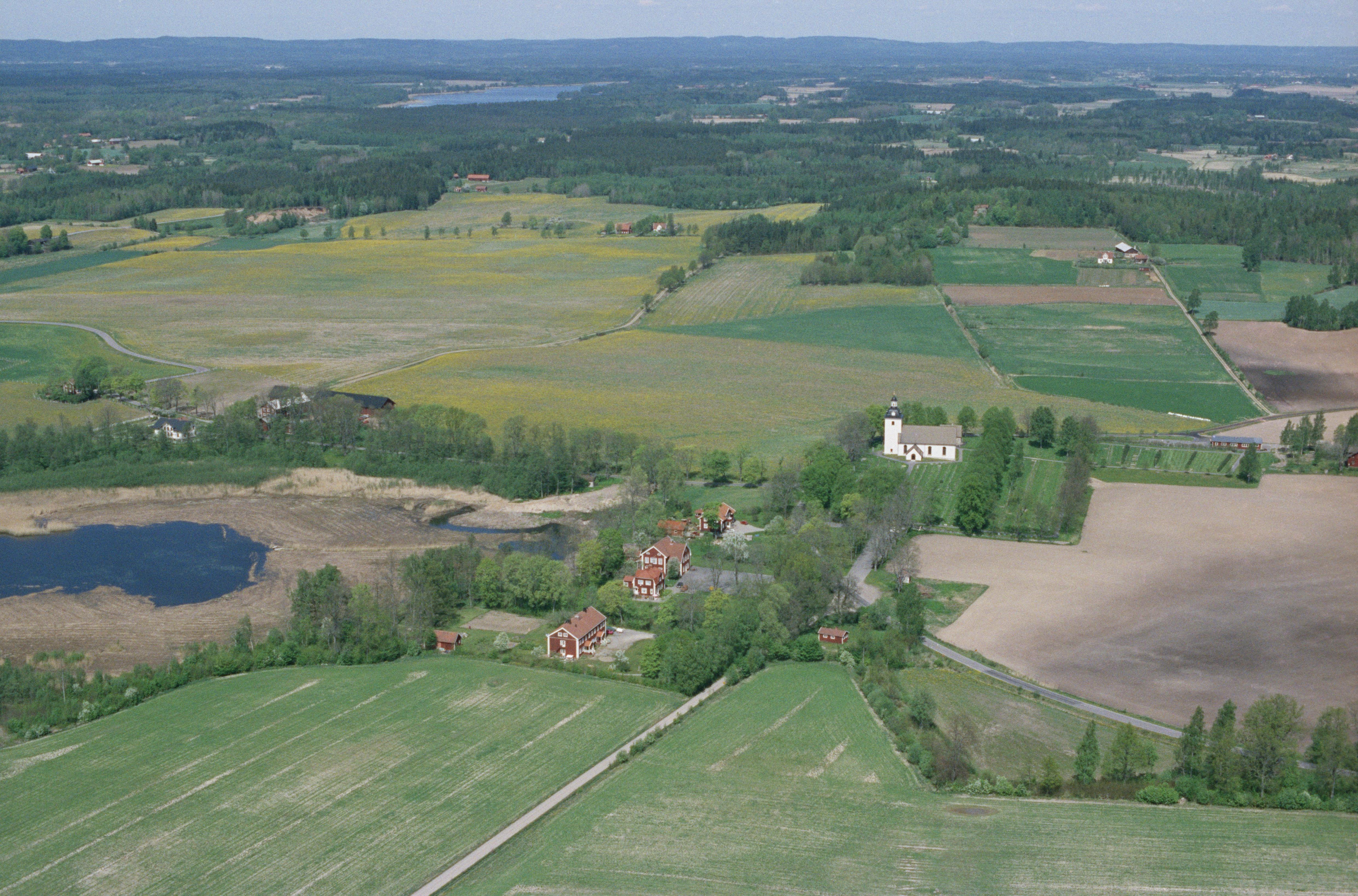 Beskrivning: Viby gård, Viby hembygdsgård och Viby kyrka vid Vibysjön. Bilden är tagen mot (väderstreck): NNV