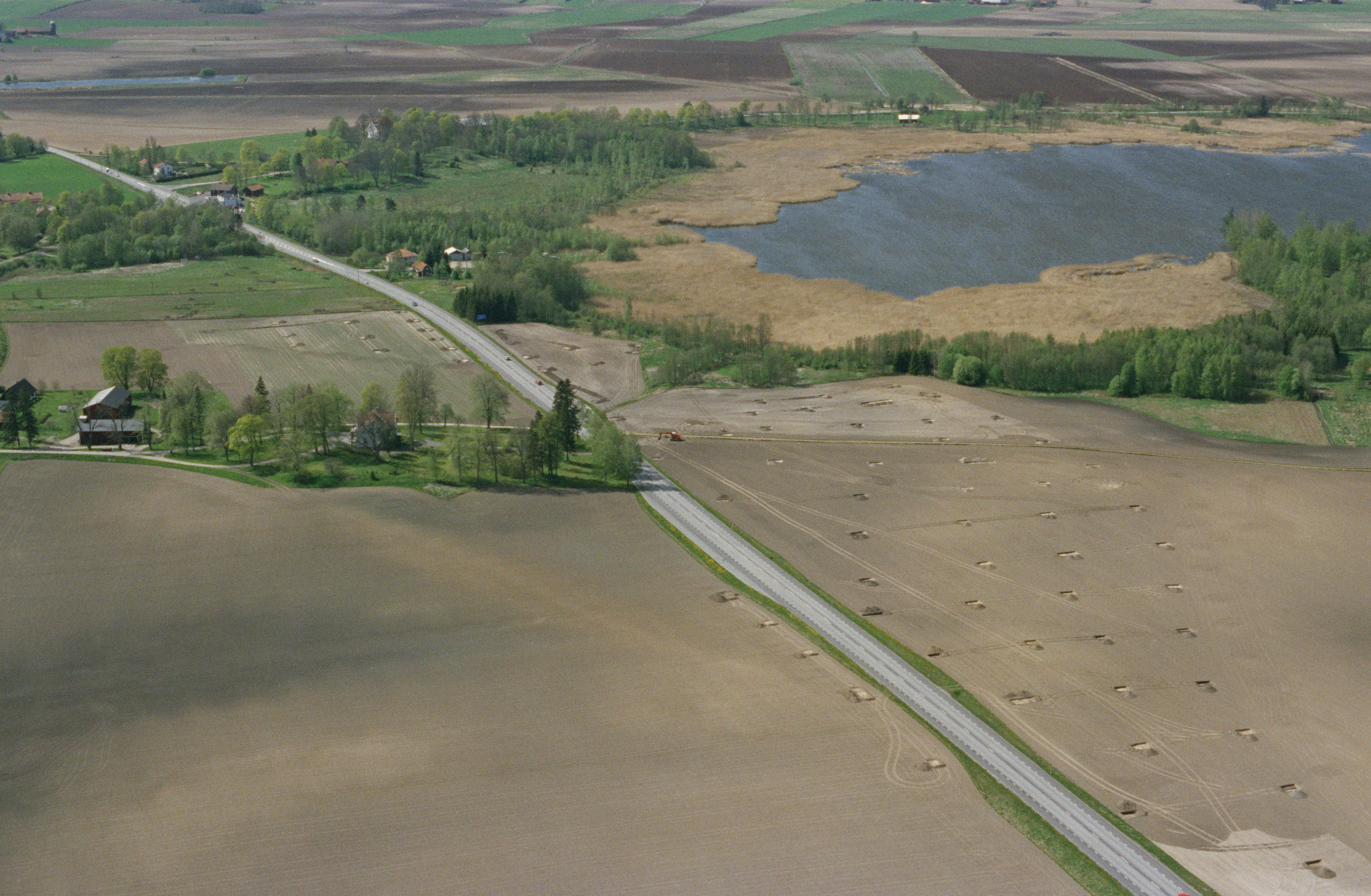 Beskrivning: Arkeologisk undersökning innan vägbygge av E3 / E20 söder om Vibysjön. Bytomt RAÄnr Viby 122:1 och 222:1. Till vänster i bildens övre del gårdarna Stora och Lilla Vretstorp. Bilden är tagen mot (väderstreck): NV