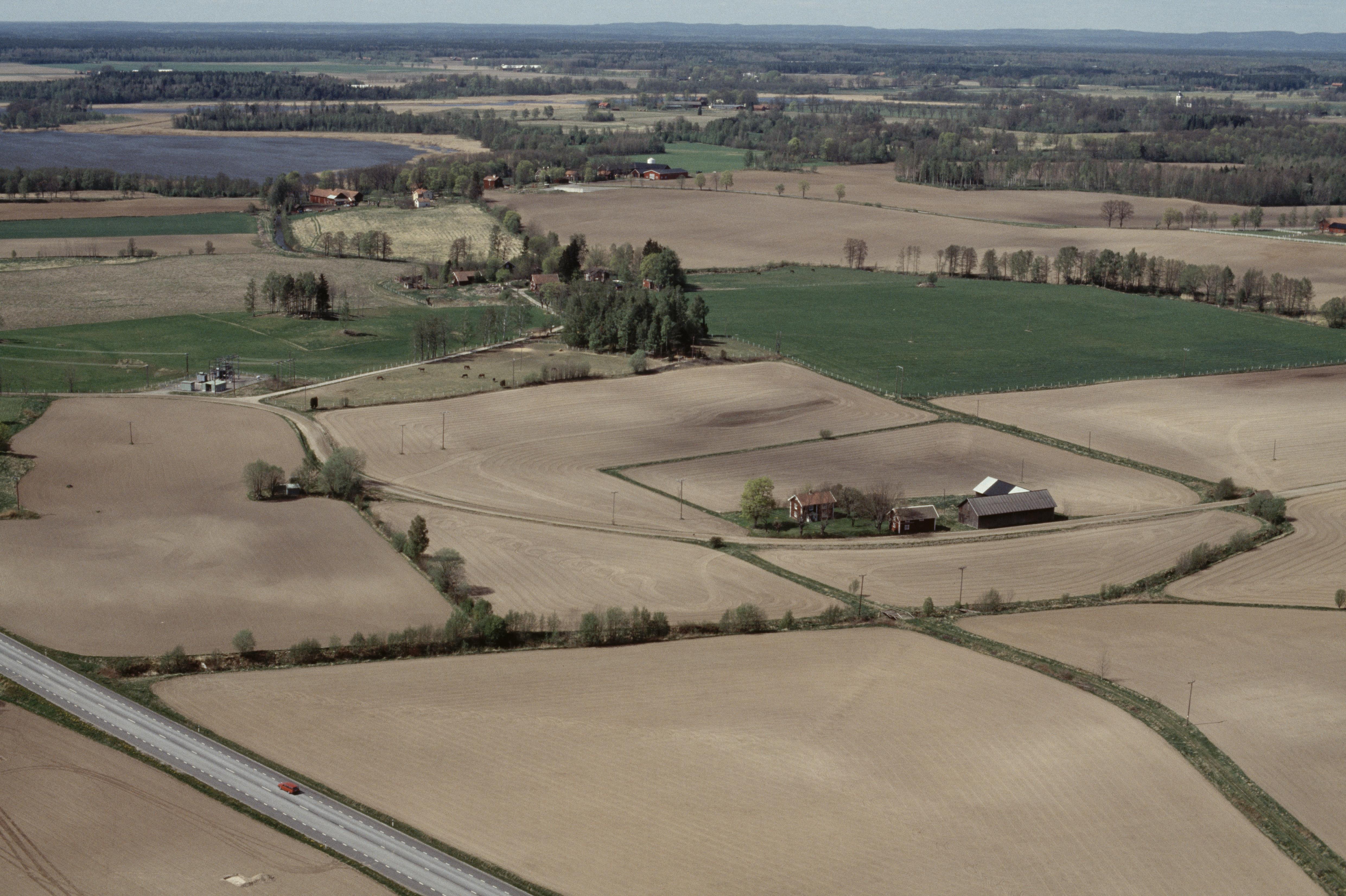 Beskrivning: Ängatorps gård innan vägbygge av E3 / E20. Gårdarna Vreten och Sjörs vid Vibysjön uppe till vänster. Vid bildens mitt bytomt RAÄnr Viby 414. Bilden är tagen mot (väderstreck): V
