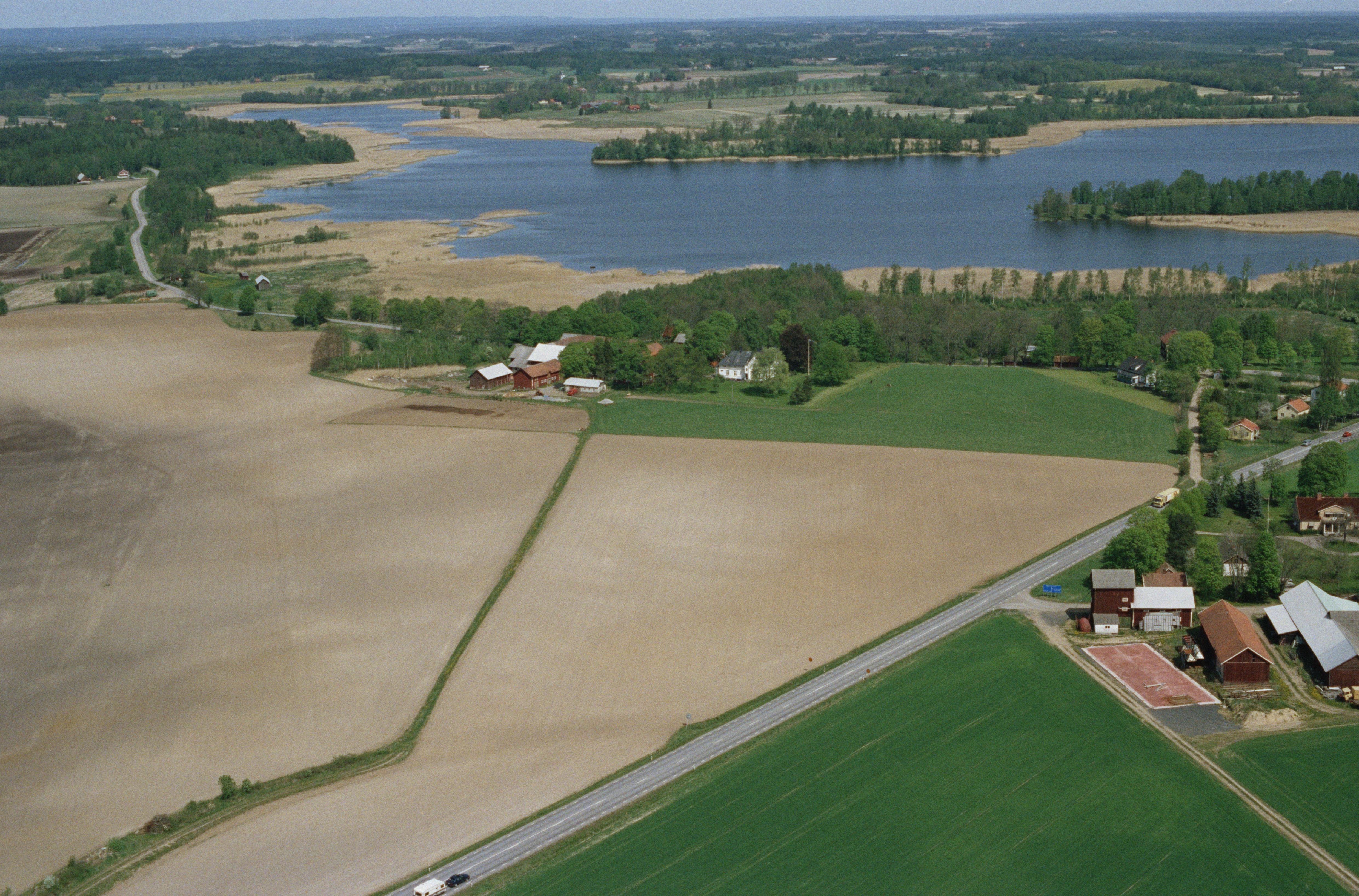 Beskrivning: Vibyslätten innan vägbygge av E3 / E20 söder om Vibysjön. Gårdarna Lilla Vretstorp och Stora Vretstorp vid bildens mitt. Bilden är tagen mot (väderstreck): NO