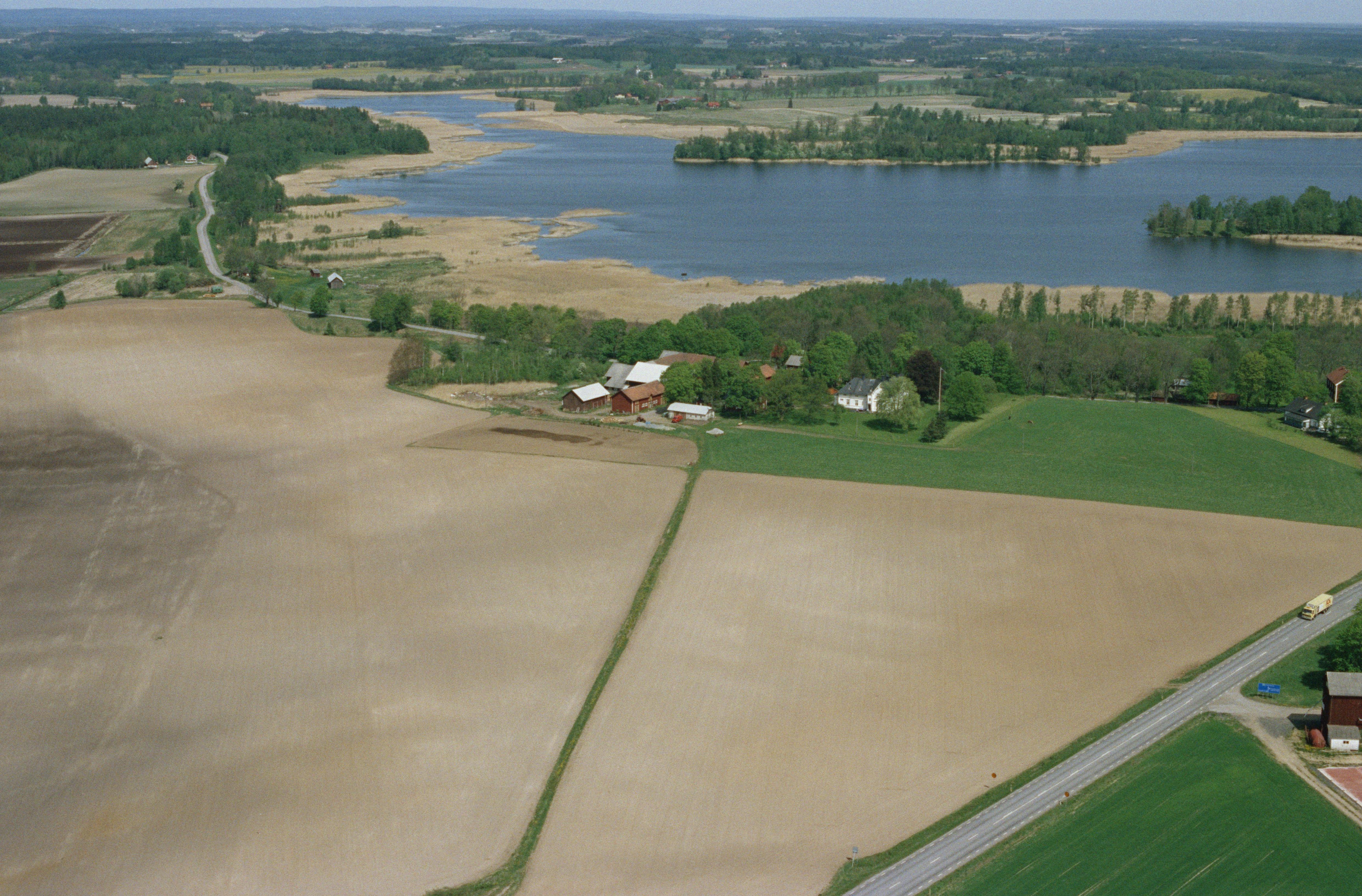 Beskrivning: Vibyslätten innan vägbygge av E3 / E20 söder om Vibysjön. Gårdarna Lilla Vretstorp och Stora Vretstorp vid bildens mitt. Bilden är tagen mot (väderstreck): NO