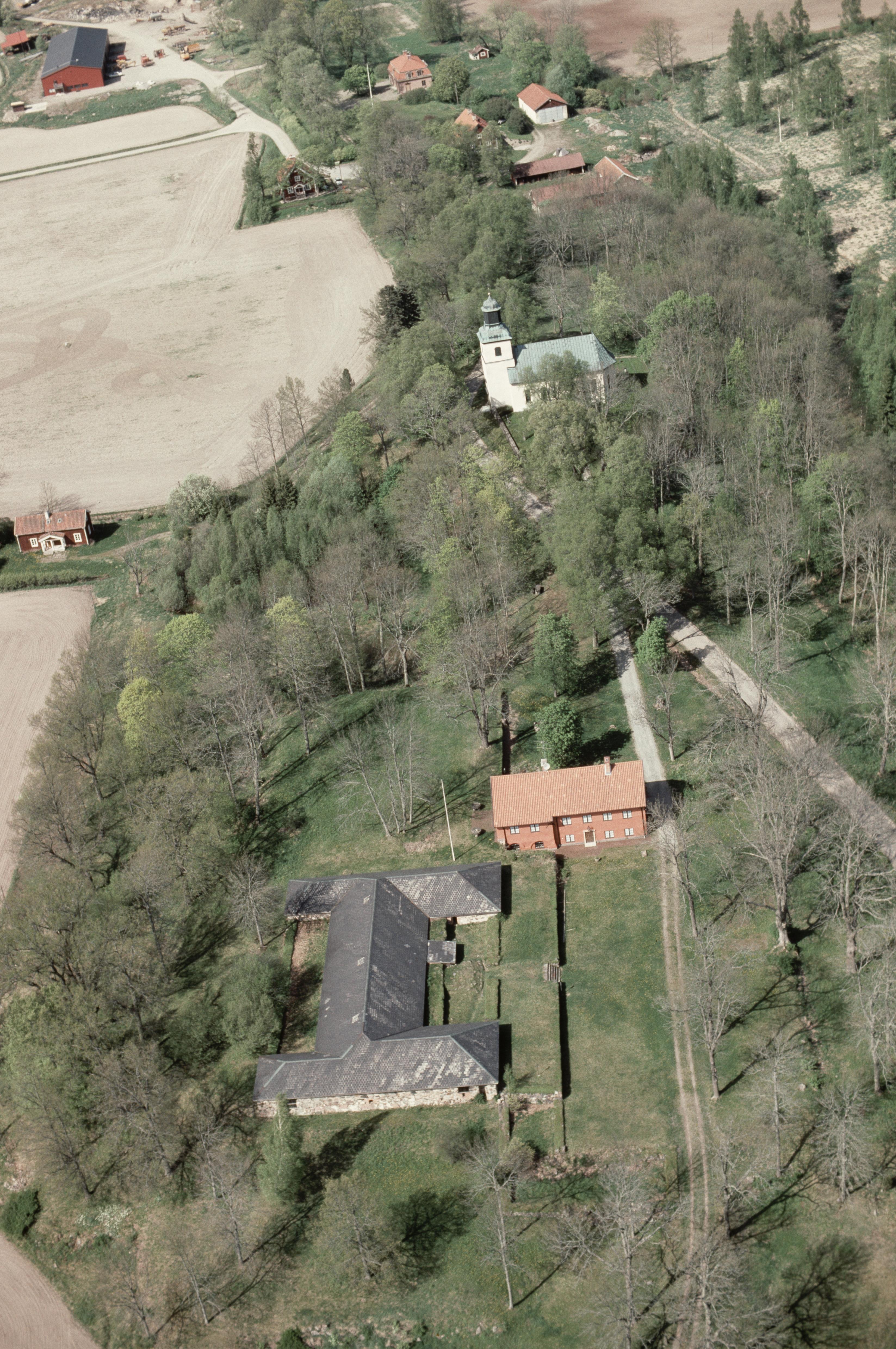 Beskrivning: Slottsruin Kägleholm RAÄnr Ödeby 8:1 (under grått skiffertak). I bildens övre del Ödeby kyrka och Kägleholms herrgård / säteri vid sjön Väringen. Bilden är tagen mot (väderstreck): N