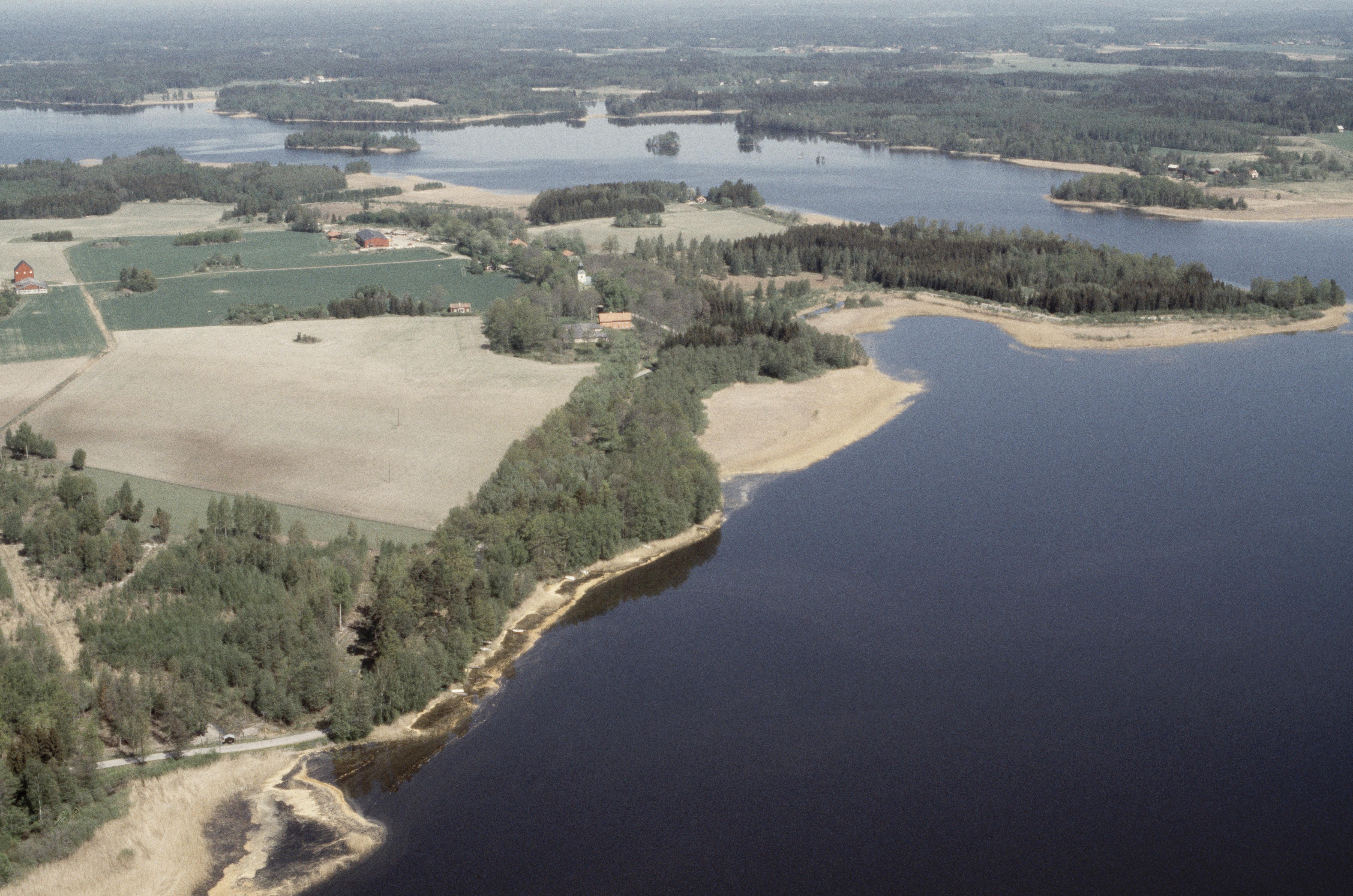 Beskrivning: Sjön Väringen. I bildens övre del slottsruin Kägleholm RAÄnr Ödeby 8:1 (under grått skiffertak), Ödeby kyrka och Kägleholms herrgård / säteri. Bilden är tagen mot (väderstreck): NNO
