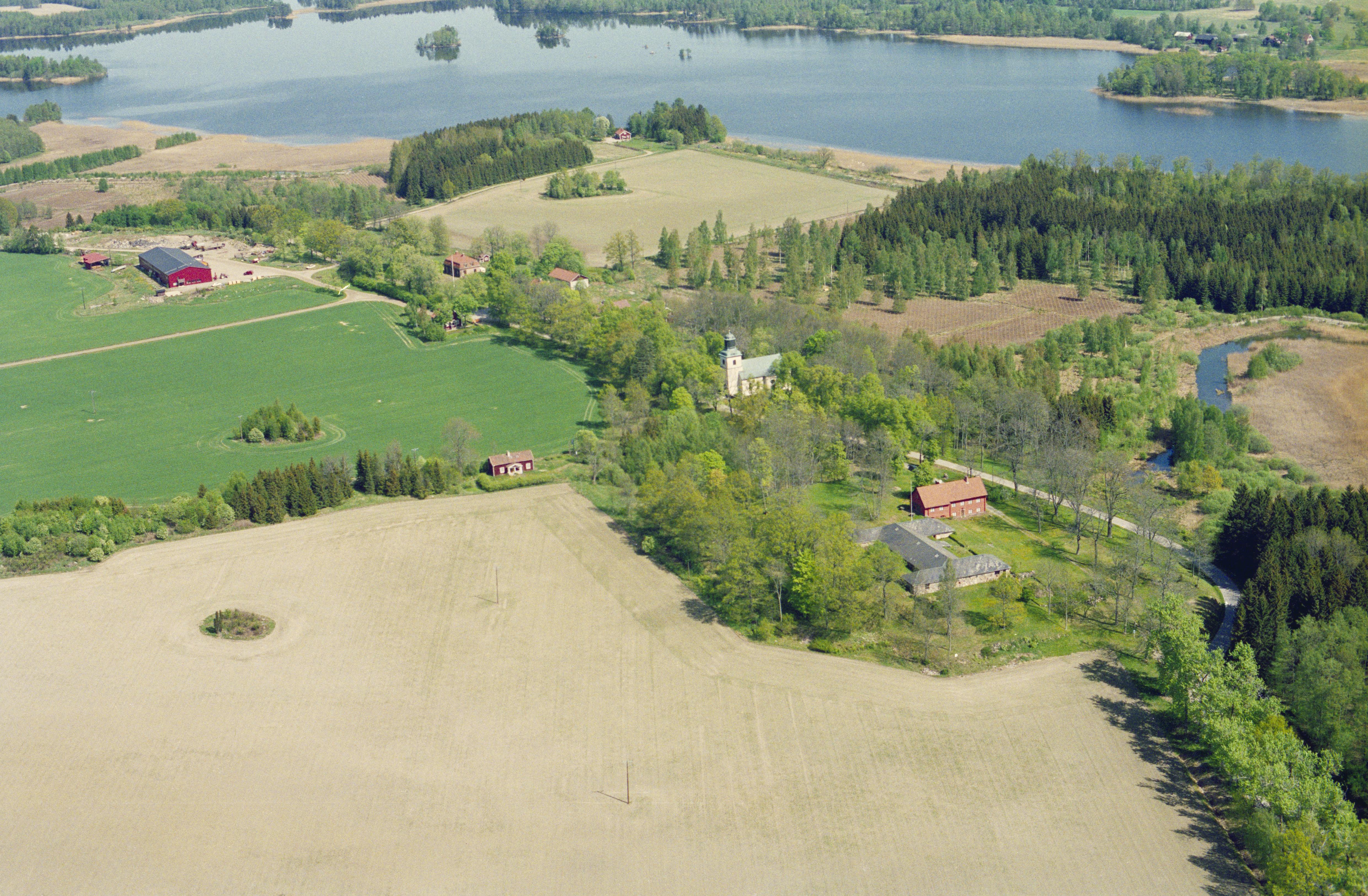 Beskrivning: Vid sjön Väringen. Från vänster Kägleholms herrgård / säteri, Ödeby kyrka och slottsruin Kägleholm RAÄnr Ödeby 8:1 (under grått skiffertak). Bilden är tagen mot (väderstreck): NO