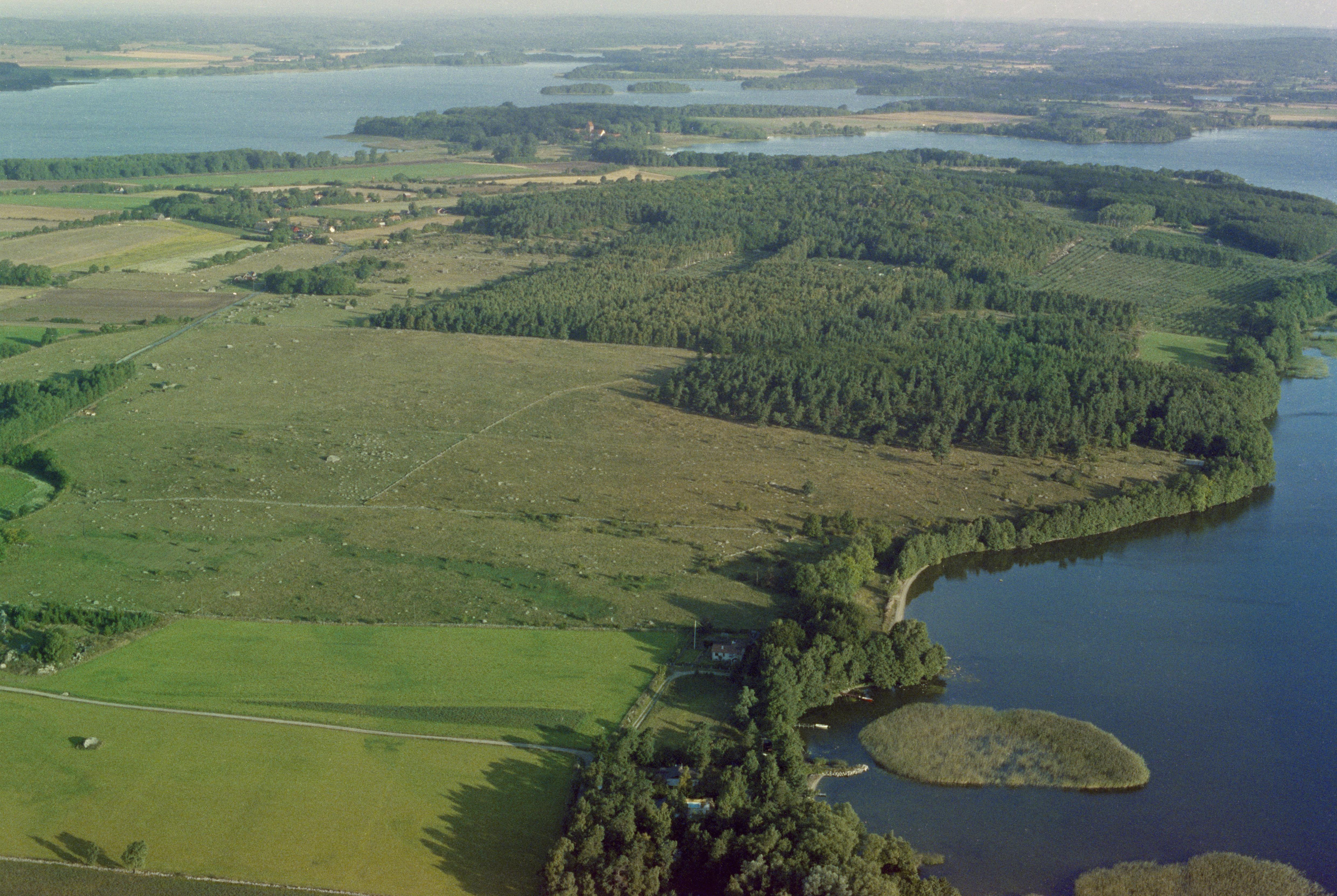 Beskrivning: Kjugekull fornlämningsområde med bl.a. Stegelbacken (Stejlabacken) RAÄnr Kiaby 95:1 och bytomt Kiaby 52:1 vid bildens mitt. I bildens övre del Skiparyd och Bäckaskogs slott. Bilden är tagen mot (väderstreck): NV